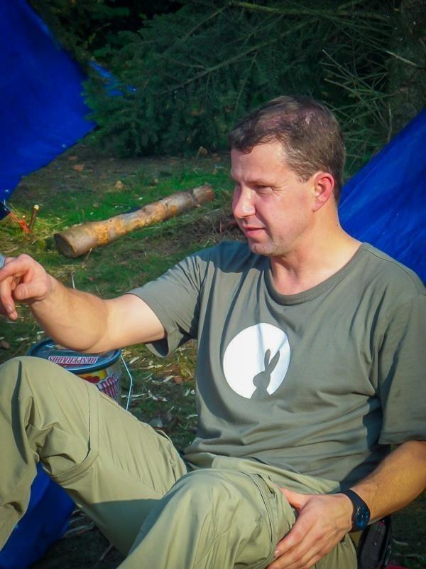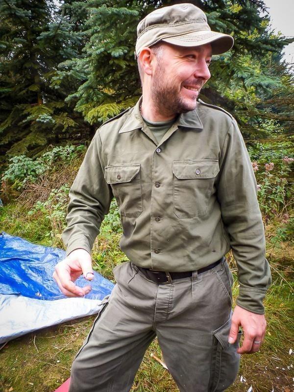 Mann in militärischer Kleidung steht neben einer blauen Plane im Wald