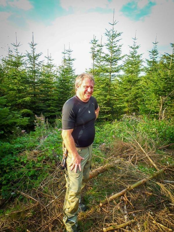 Dichte Nadelbäume umgeben einen kleinen Bereich mit Holzstämmen und Sträuchern