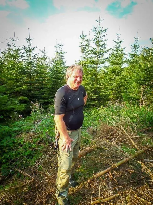 Mann steht in einem Waldgebiet zwischen Bäumen und Gestrüpp