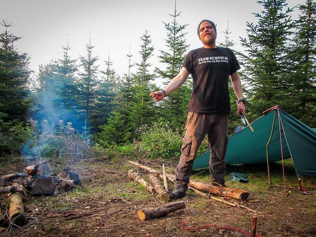 Mann steht neben einer Tarp-Notunterkunft und einem kleinen Feuer im Wald