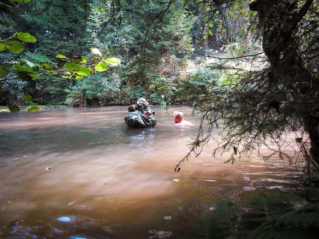 Personen schwimmen in einem trüben Gewässer zwischen Pflanzen und Bäumen