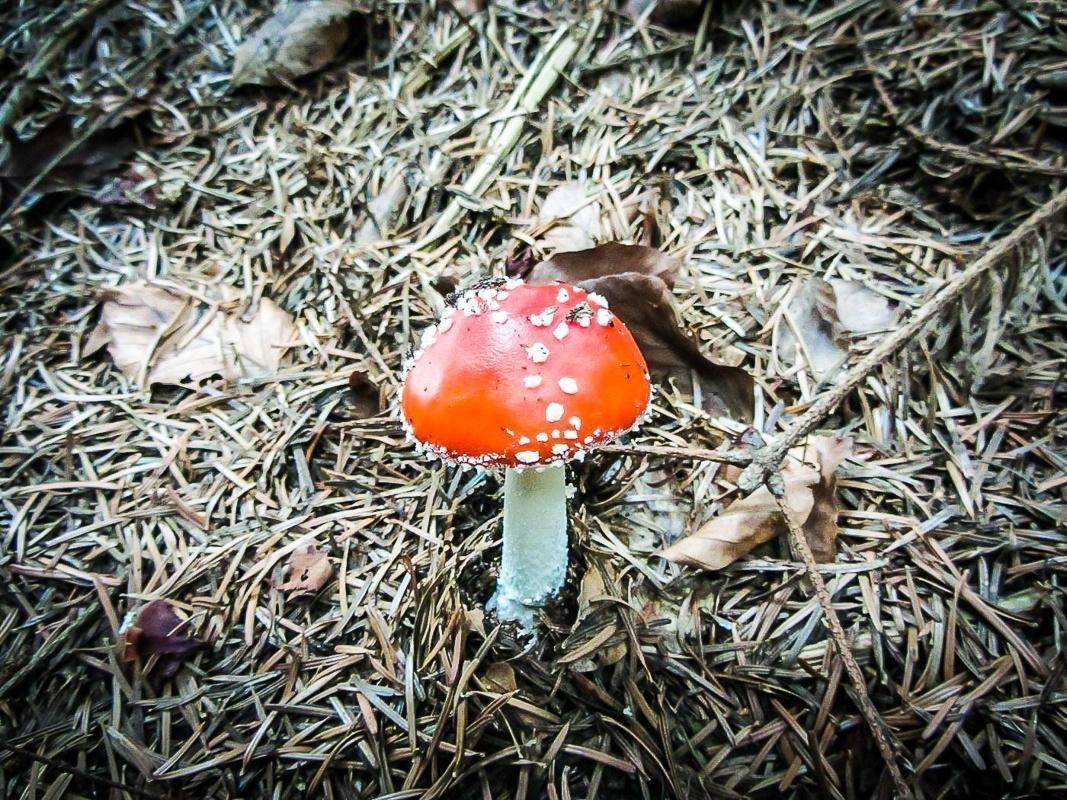 Roter Pilz mit weißen Punkten auf Waldboden aus Nadeln und Blättern