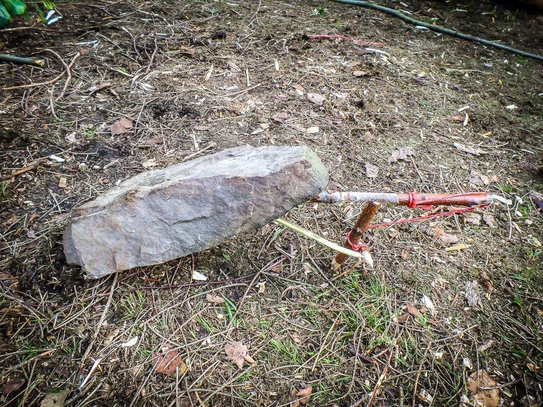 Schlagfalle (Figure-Four) mit Stein und Holzstücken konstruiert