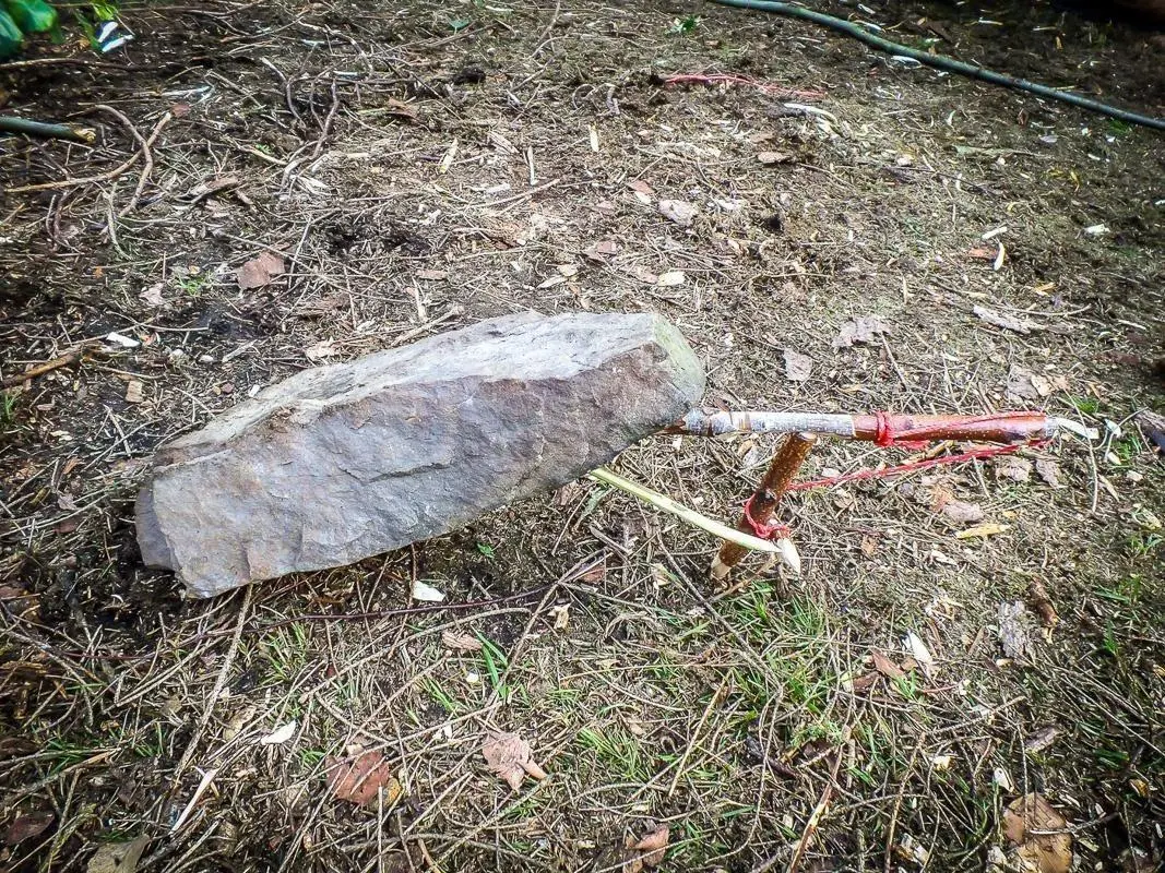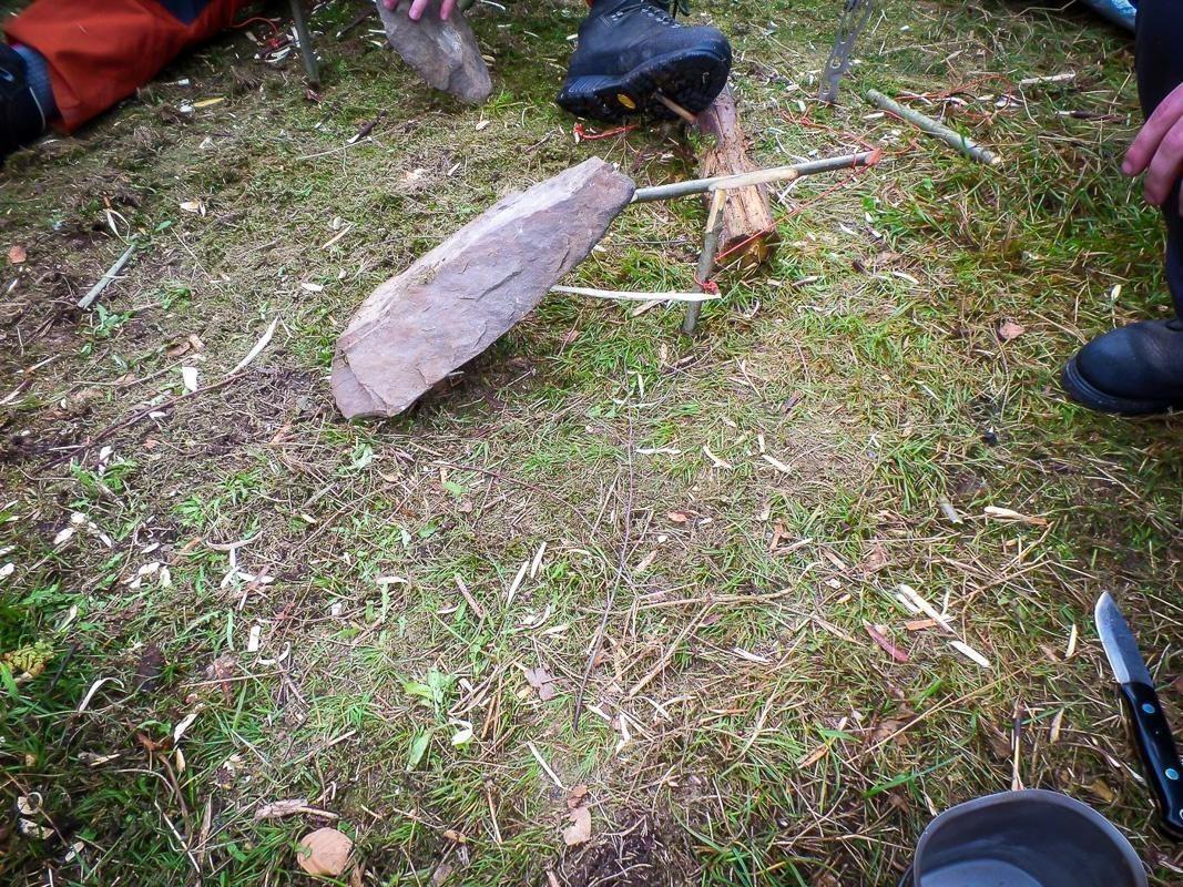 Schlagfalle (Figure-Four) mit Stein als Gewicht und Holzstücken als Konstruktion
