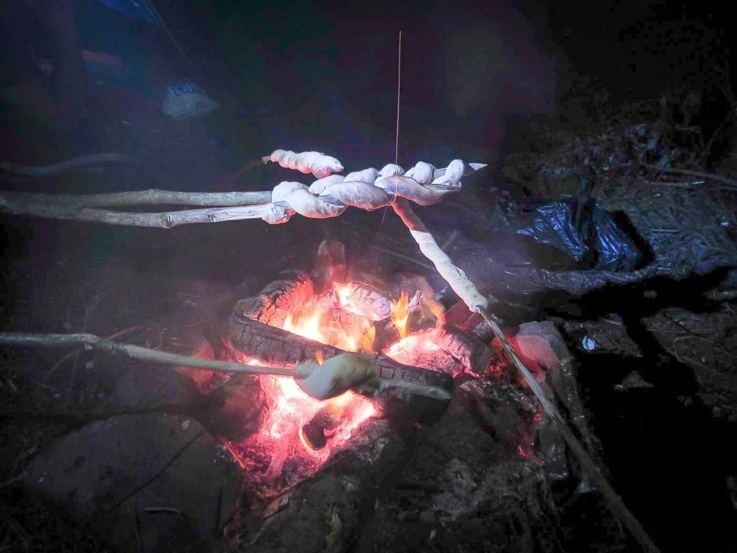 Gruppe steht um ein kleines Bodenfeuer, Tarp-Notunterkünfte im Hintergrund