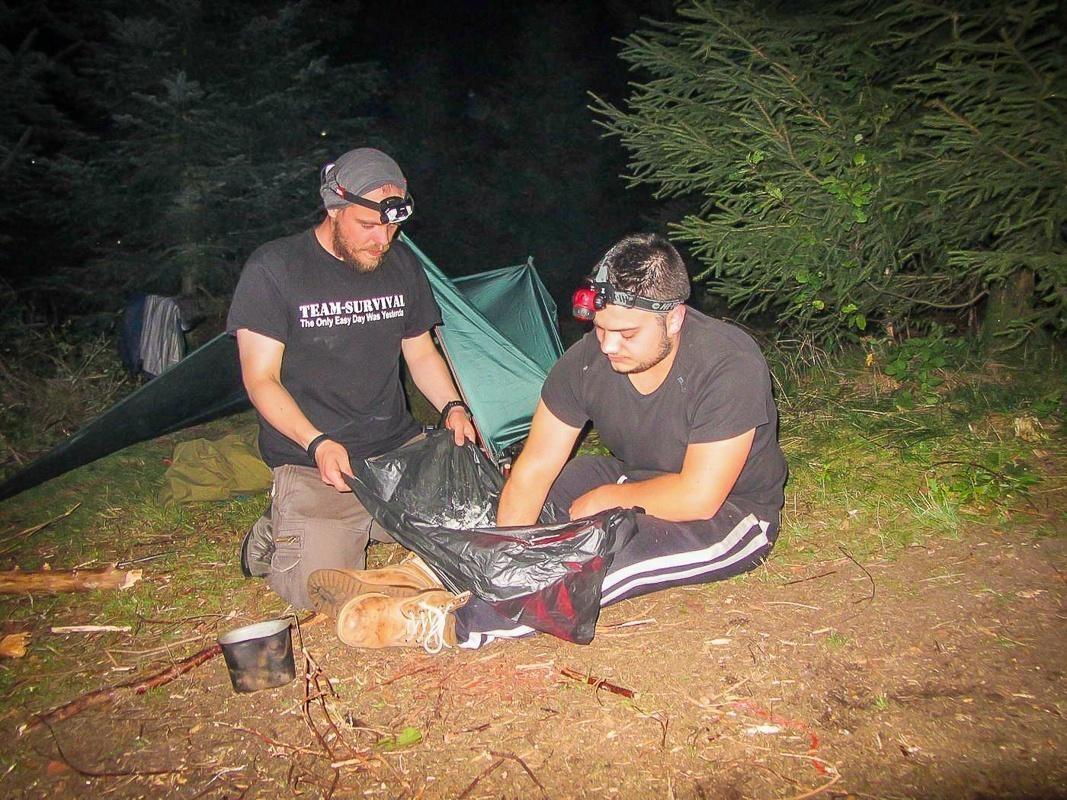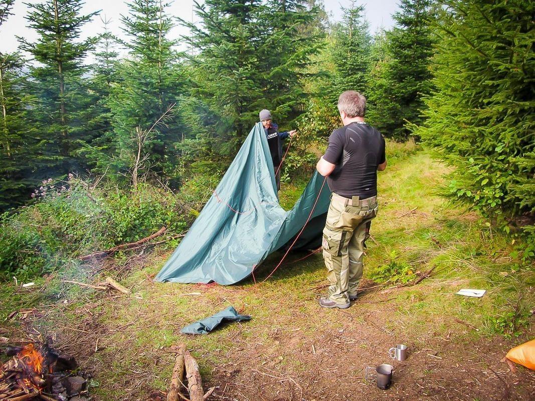 Zwei Personen bauen eine Tarp-Notunterkunft im Wald auf