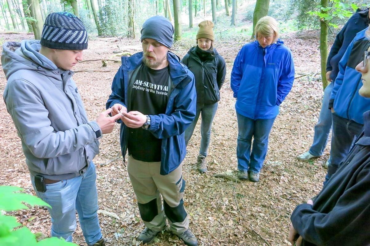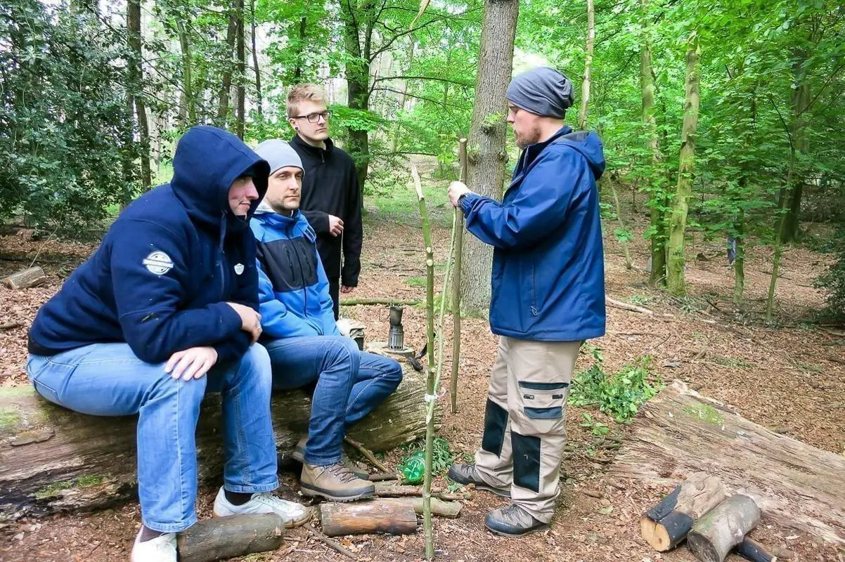 Ein Mann zeigt einem anderen eine Technik im Wald, während mehrere Personen zuschauen