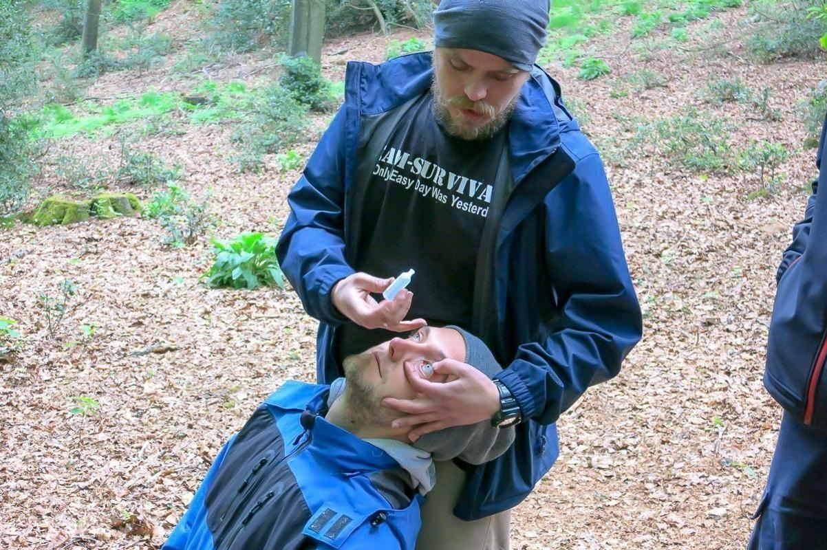 Erste-Hilfe-Maßnahme mit Spray auf das Gesicht einer liegenden Person im Wald