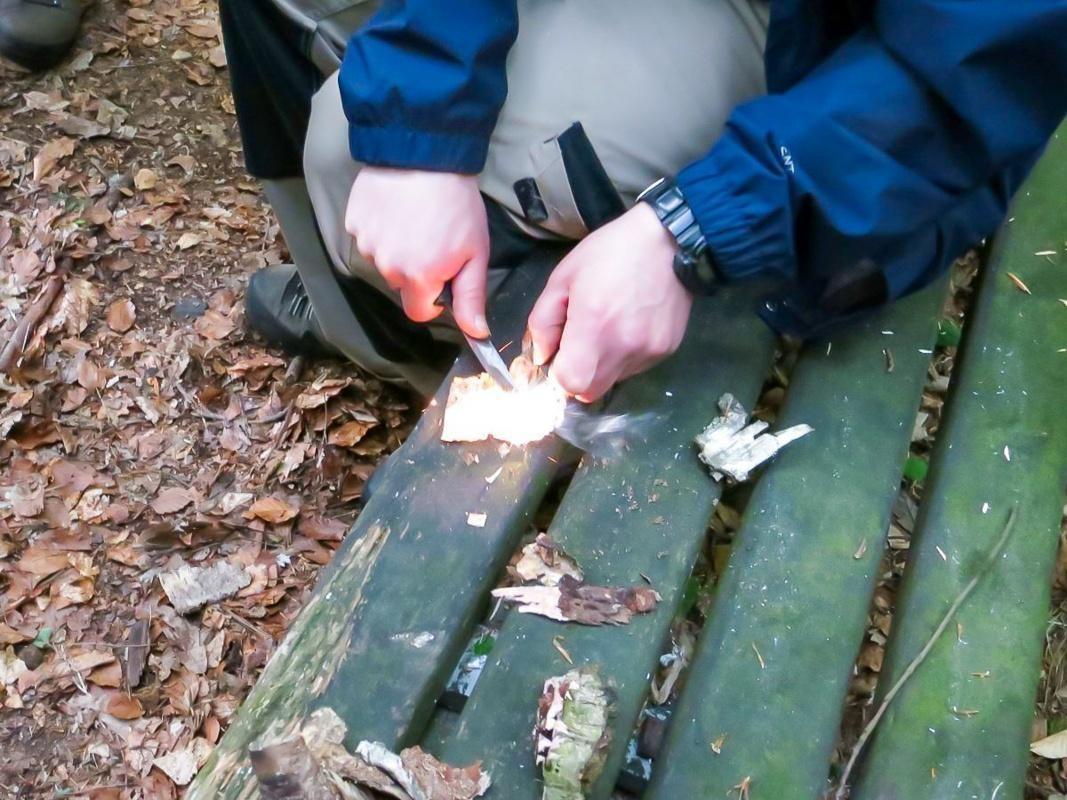 Feuerstahl erzeugt Funken auf Zunder auf einer Holzbank
