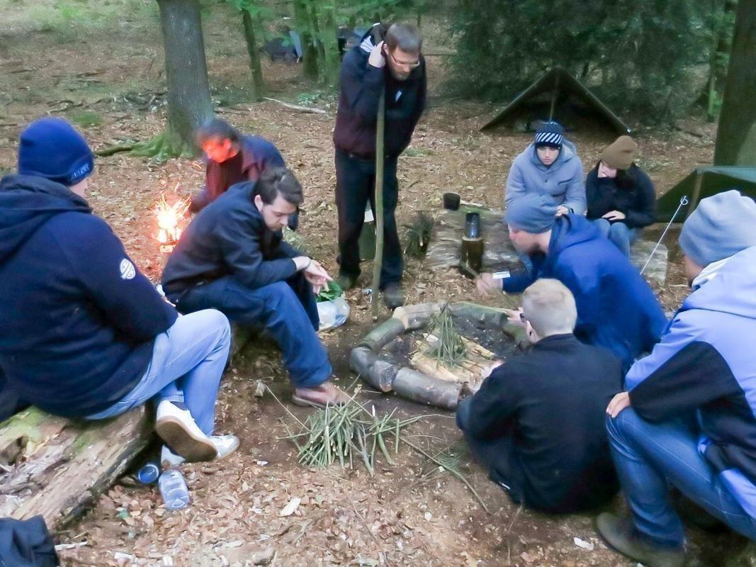 Gruppe beobachtet Anleitung zur Feuerstelle im Wald