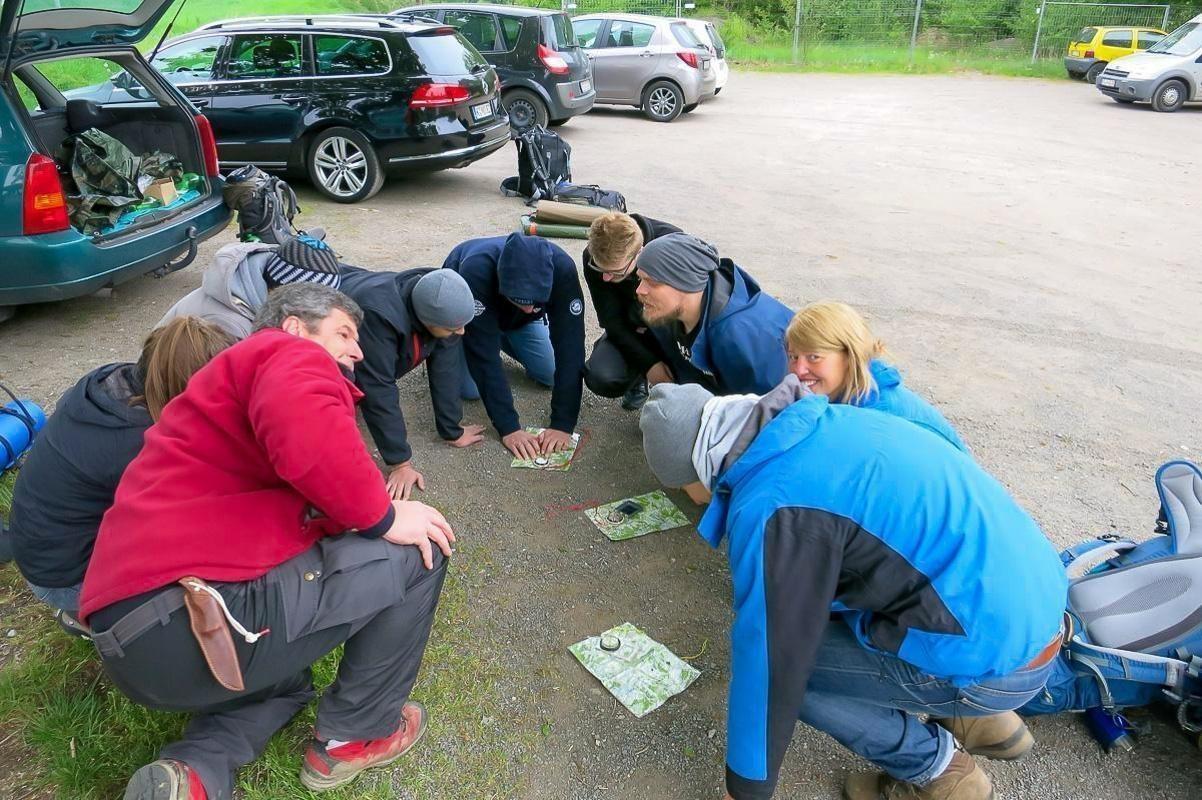 Gruppe betrachtet Kartenmaterial auf dem Boden, Rucksäcke und Autos im Hintergrund