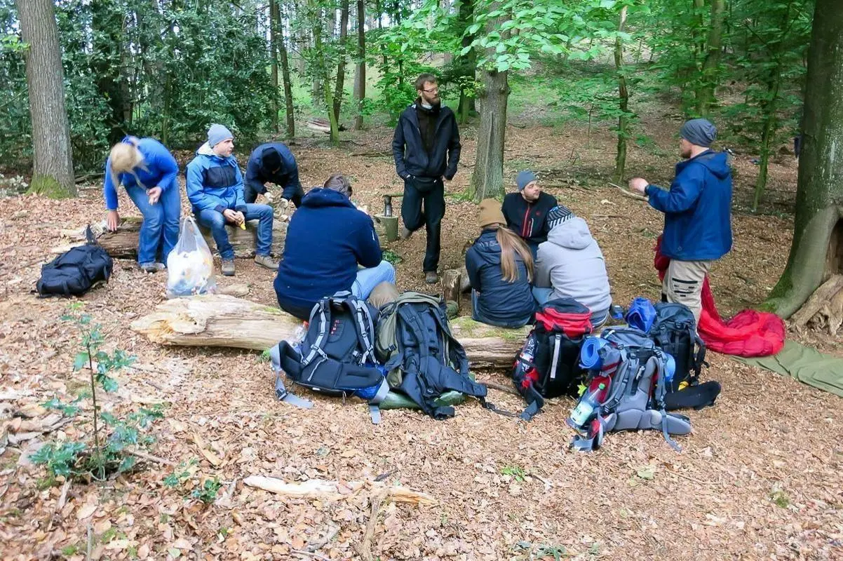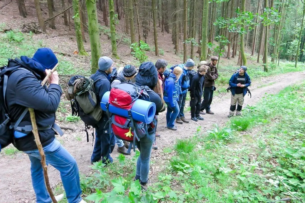 Gruppe mit Rucksäcken hört einem Trainer im Wald zu