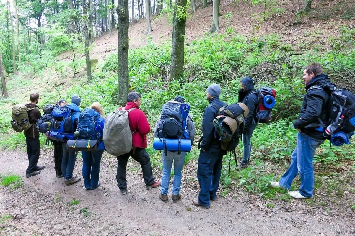Wandernde Gruppe mit Rucksäcken durch einen bewaldeten Bereich mit Laub