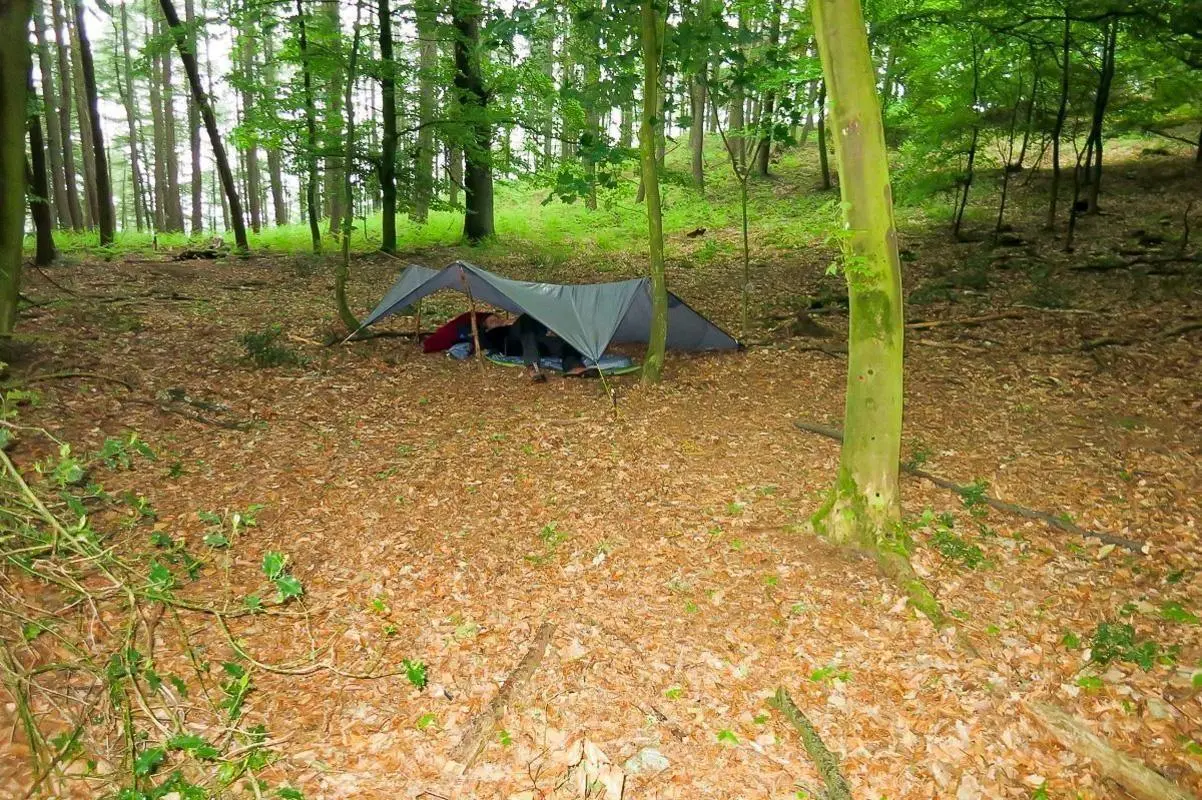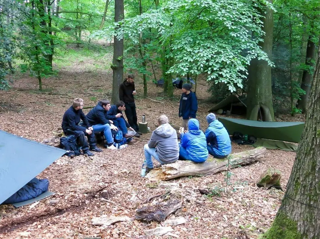 Lagerplatz im Wald mit Tarp-Notunterkunft und mehreren Personen