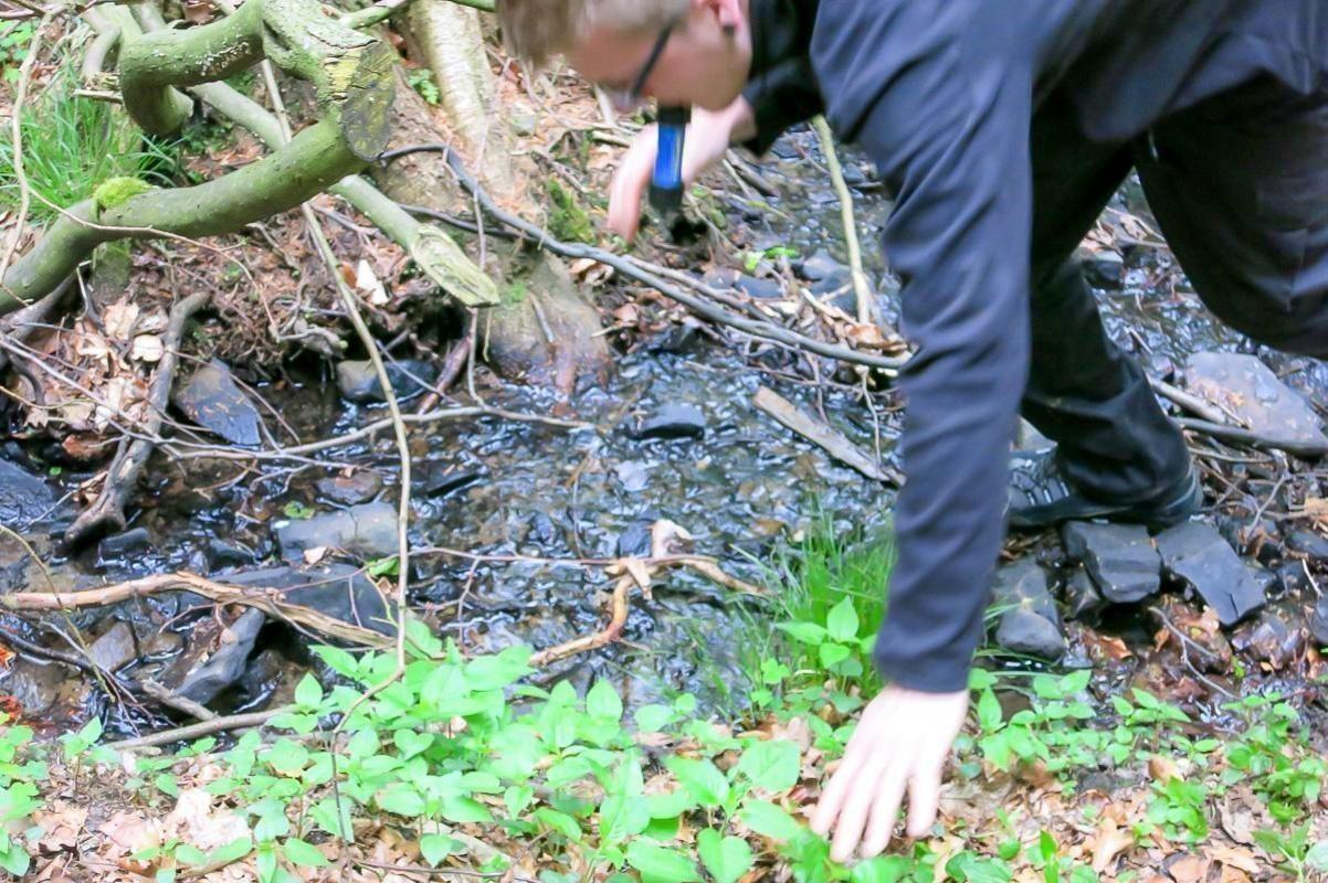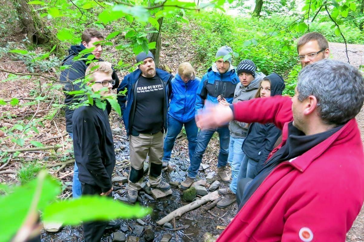 Gruppe steht um einen Referenten an einem kleinen Bachlauf im Wald