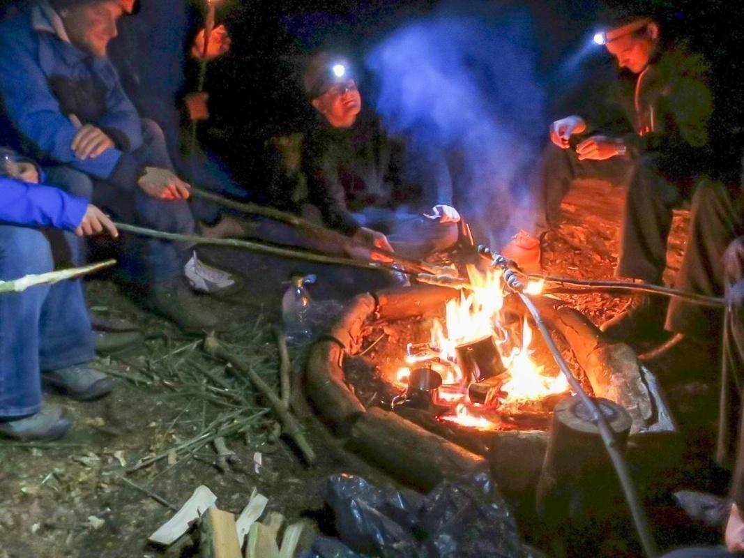 Kessel über offenem Feuer, Teilnehmer halten Stöcke und bereiten Essen vor