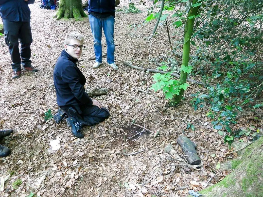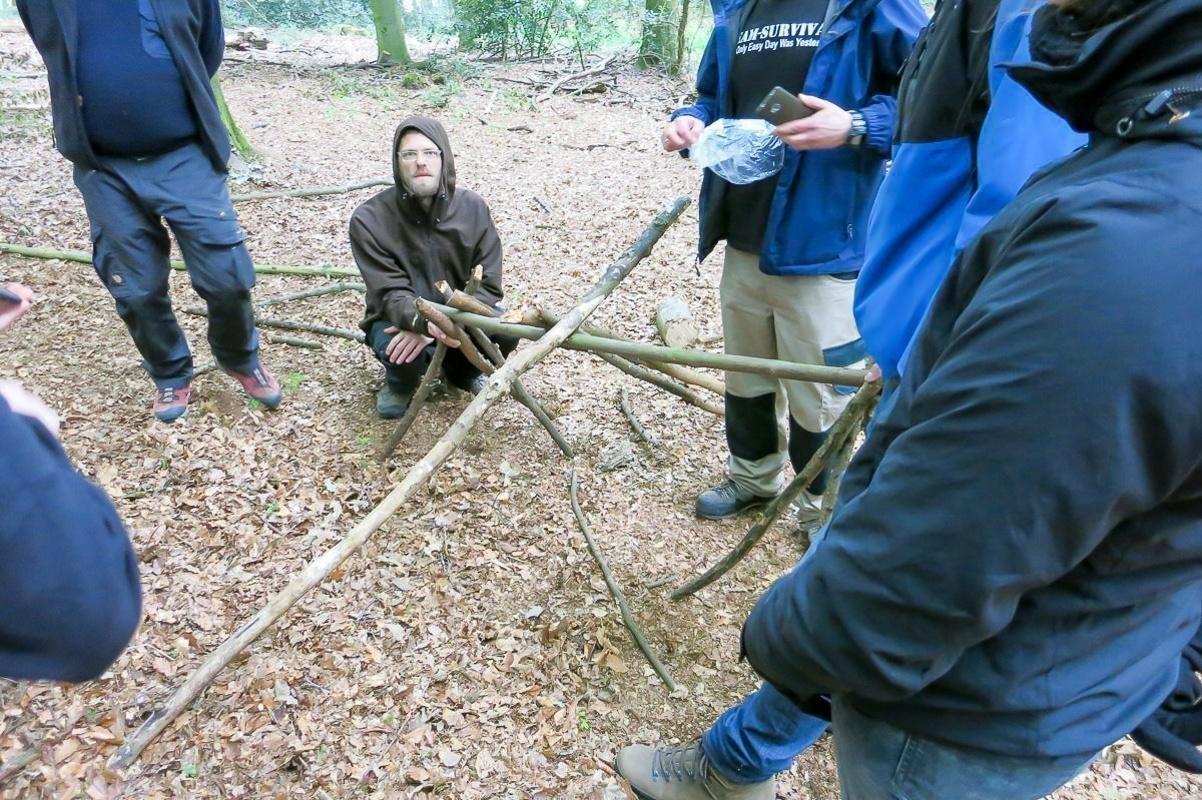Ein weiterer wichtiger Bestandteil des Kurses war der Bau von Unterständen und Wetterschutz. Die Gruppe erstellte selbstgebaute Unterkünfte aus Ästen und Blättern, um sich vor den Elementen zu schützen. Dabei wurde auch das sichere Arbeiten mit dem Messer geübt, was für das Schnitzen und die Bearbeitung von Materialien von Bedeutung war. Die Teilnehmer lernten, wie sie mit einfachen Mitteln einen effektiven Schutzraum schaffen konnten, der ihnen in einer Notsituation als Zufluchtsort dienen würde.
