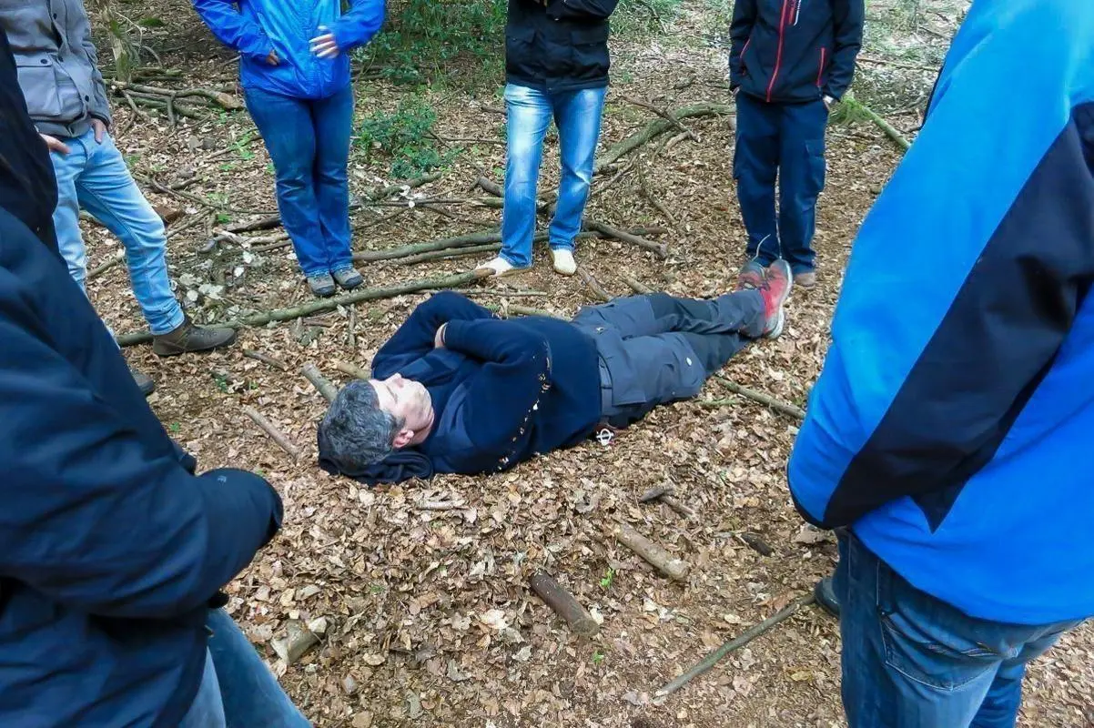 Gruppe beobachtet Erste-Hilfe-Übung auf einer Matte im Wald