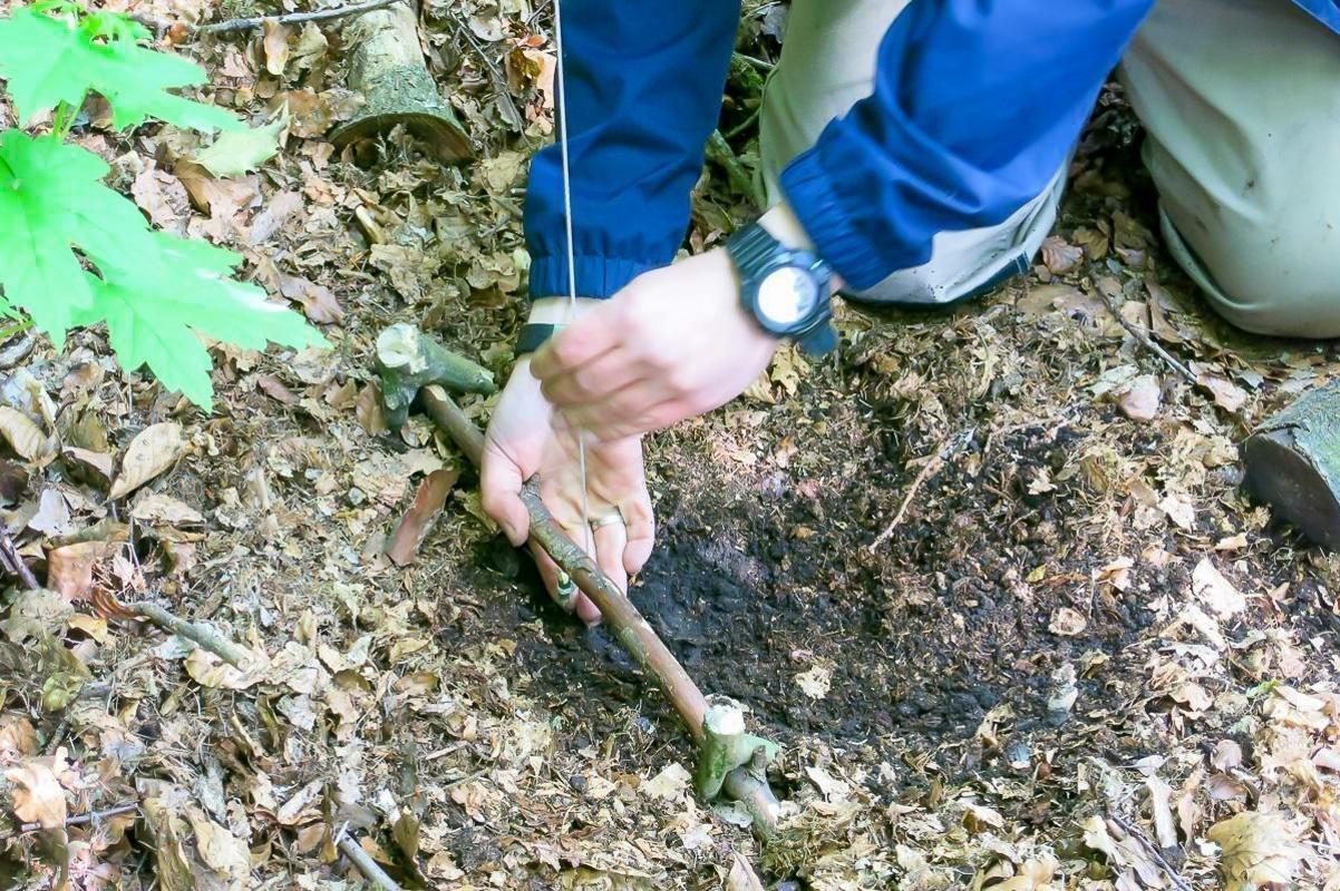 Schlingenfalle ist unter einem Baum sichtbar, während eine Person sie fotografiert