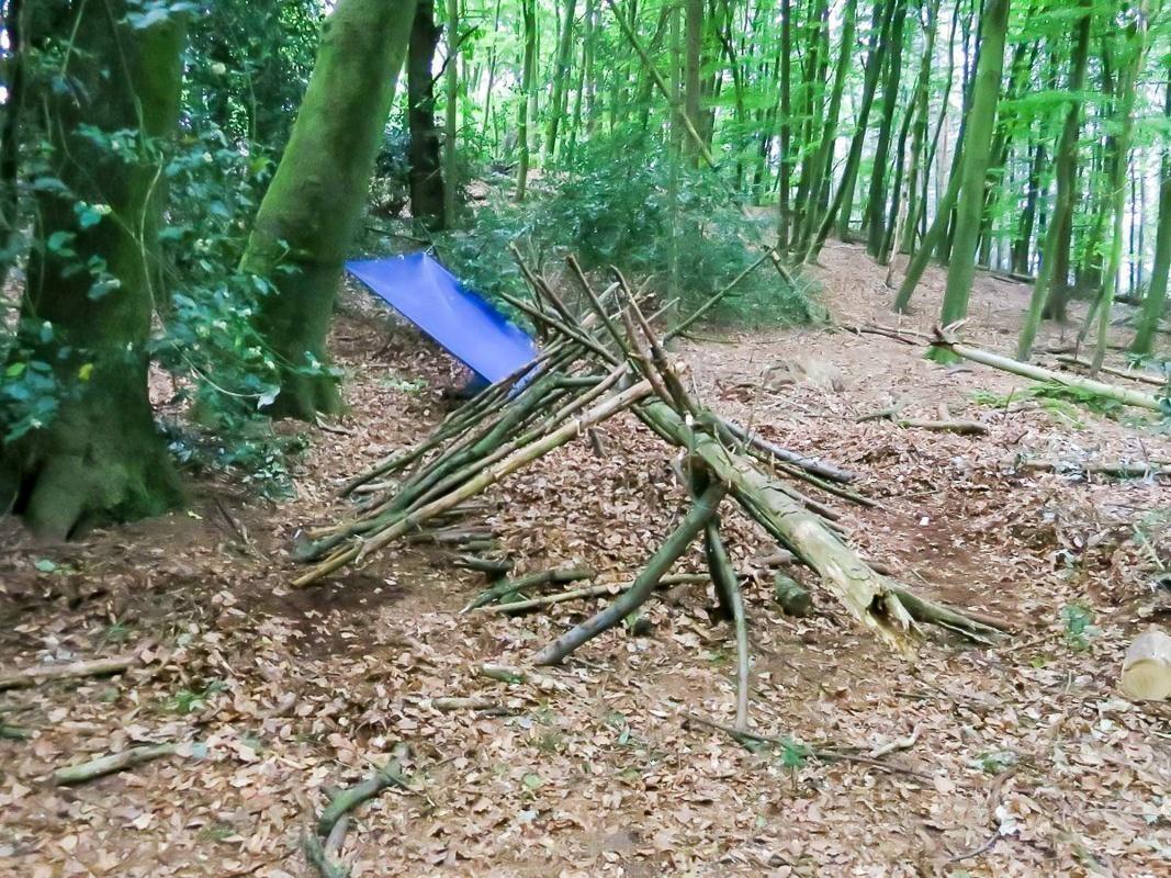 Selbstgebaute Tarp-Notunterkunft aus Ästen und einer blauen Plane im Wald