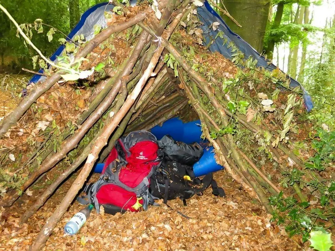 Tarp-Notunterkunft aus Ästen und Blättern mit Rucksäcken im Inneren
