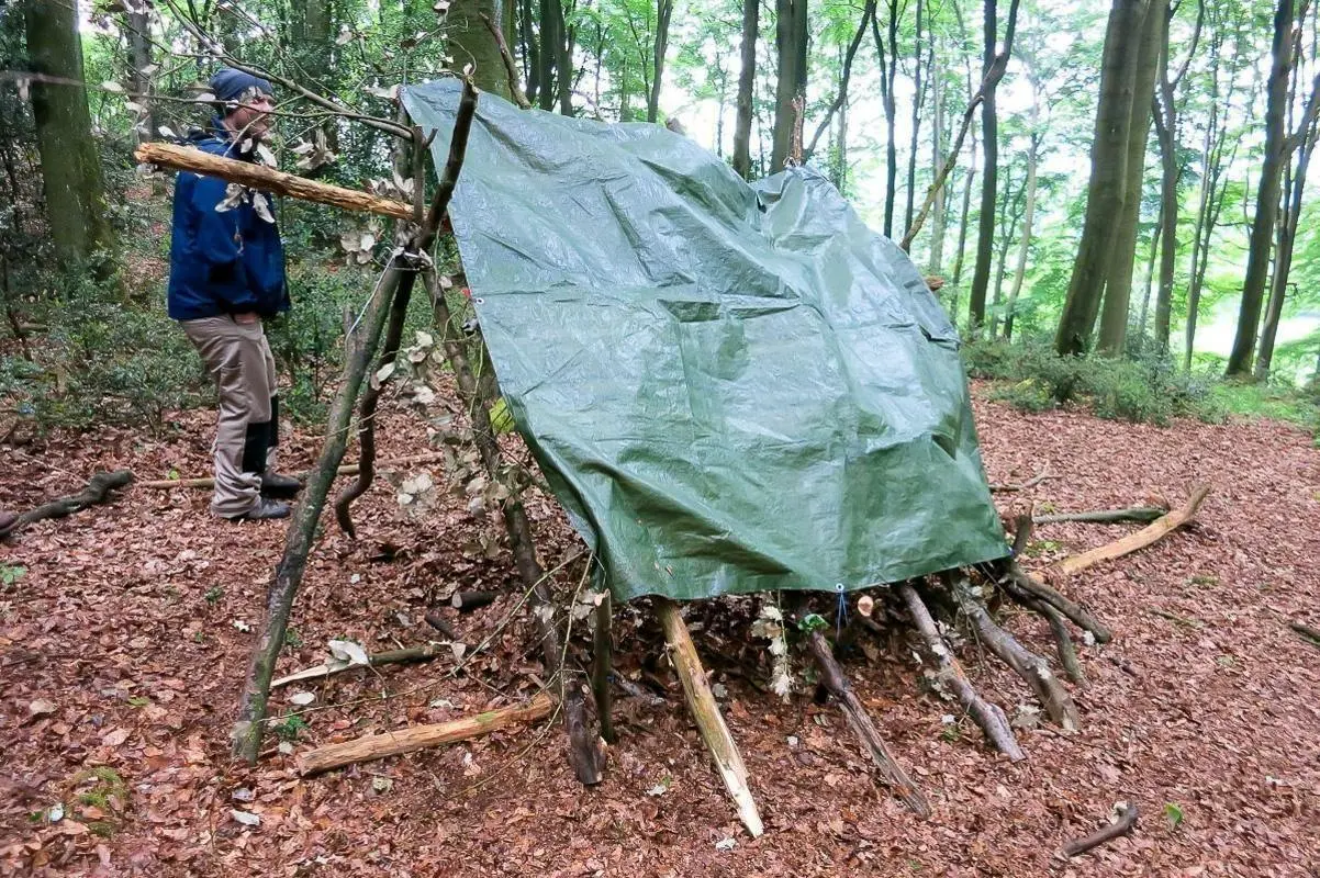 Gruppe steht vor einer Tarp-Notunterkunft aus Ästen und einer Plane im Wald