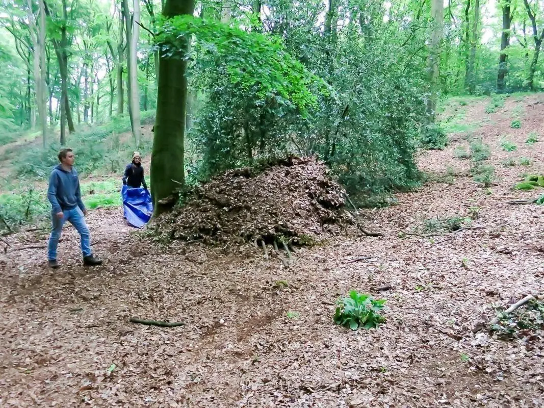 Selbstgebaute Konstruktion aus Ästen im Wald, umgeben von mehreren Personen