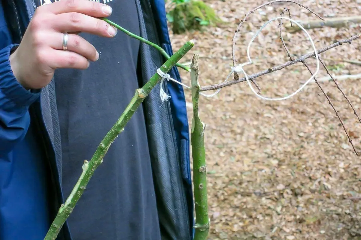 Schlagfalle (Figure-Four-Falle) wird mit Ästen und Schnur vorbereitet