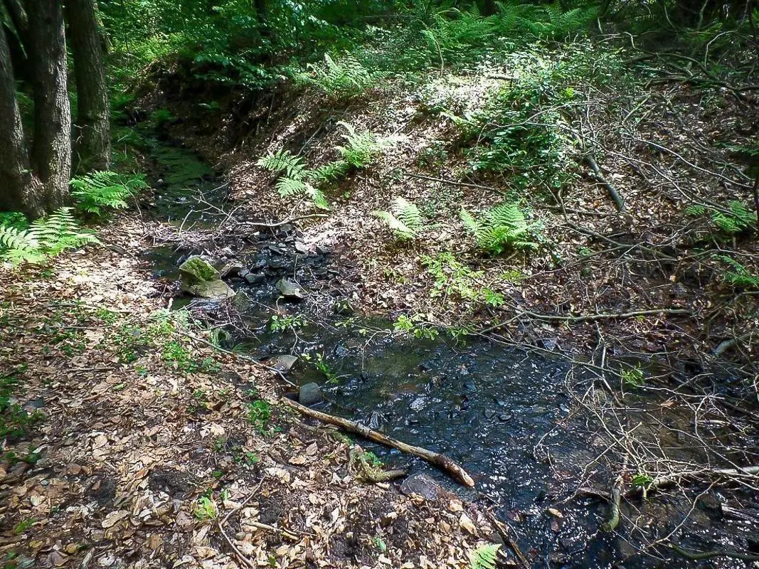 Bachlauf mit Steinen und Laub, umgeben von Farnen und Bäumen