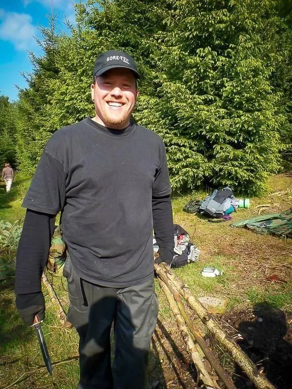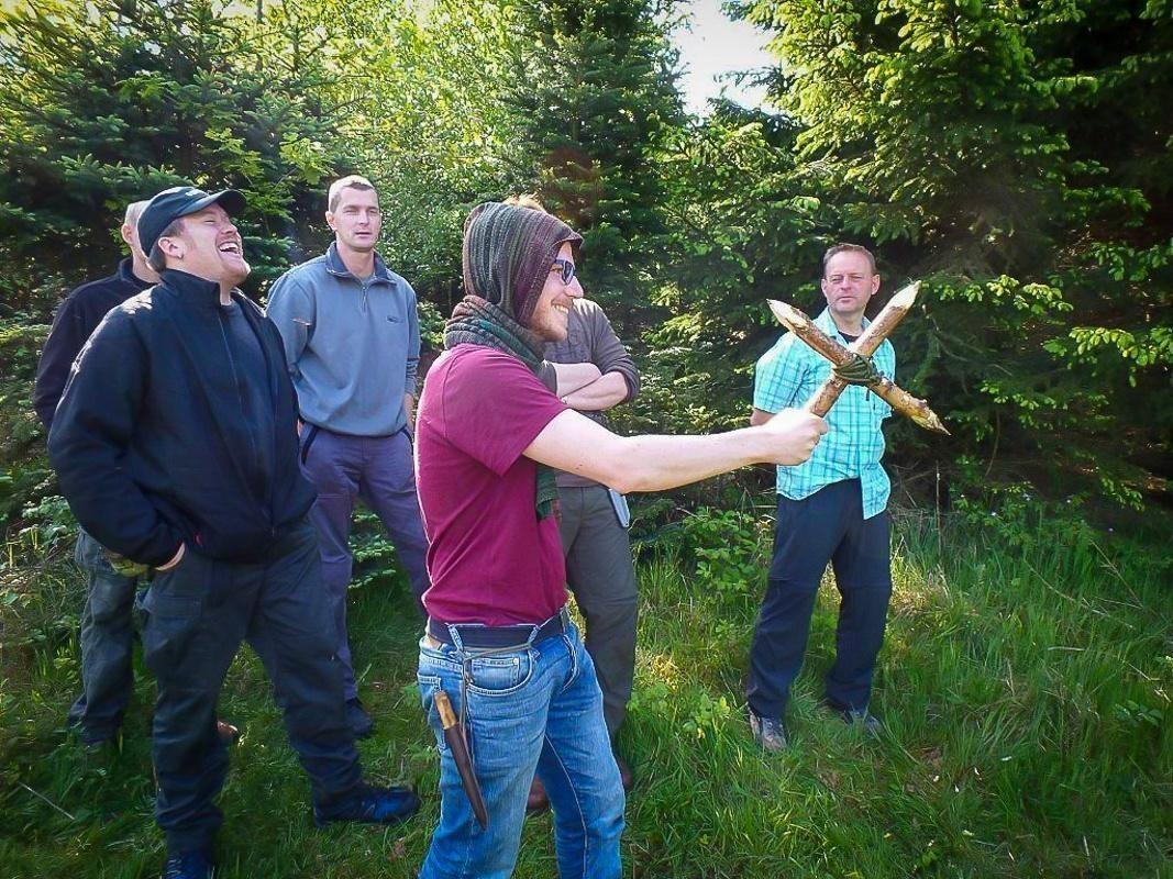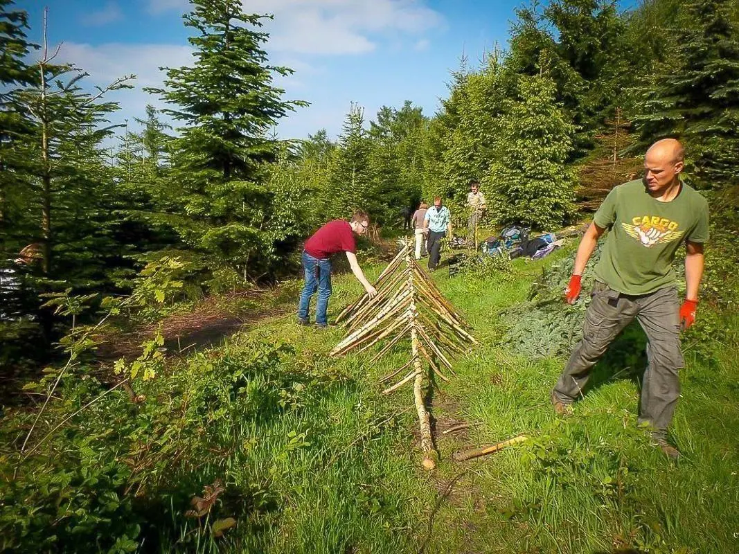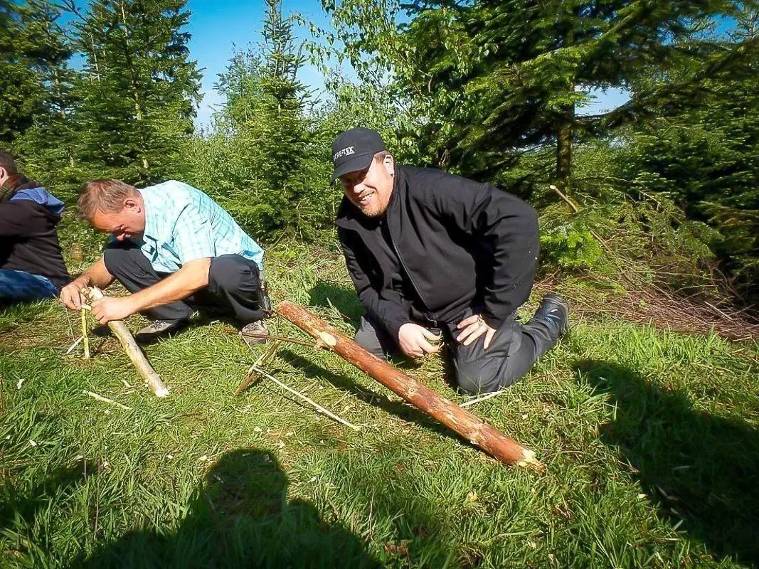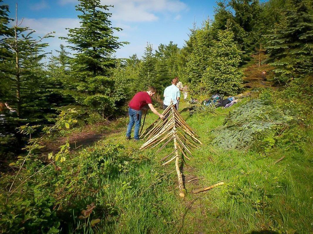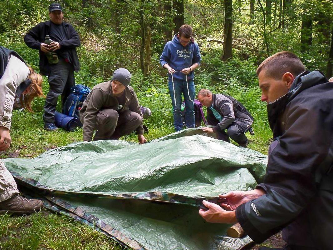 Teilnehmer bauen eine Tarp-Notunterkunft im Wald mit Holzstöcken