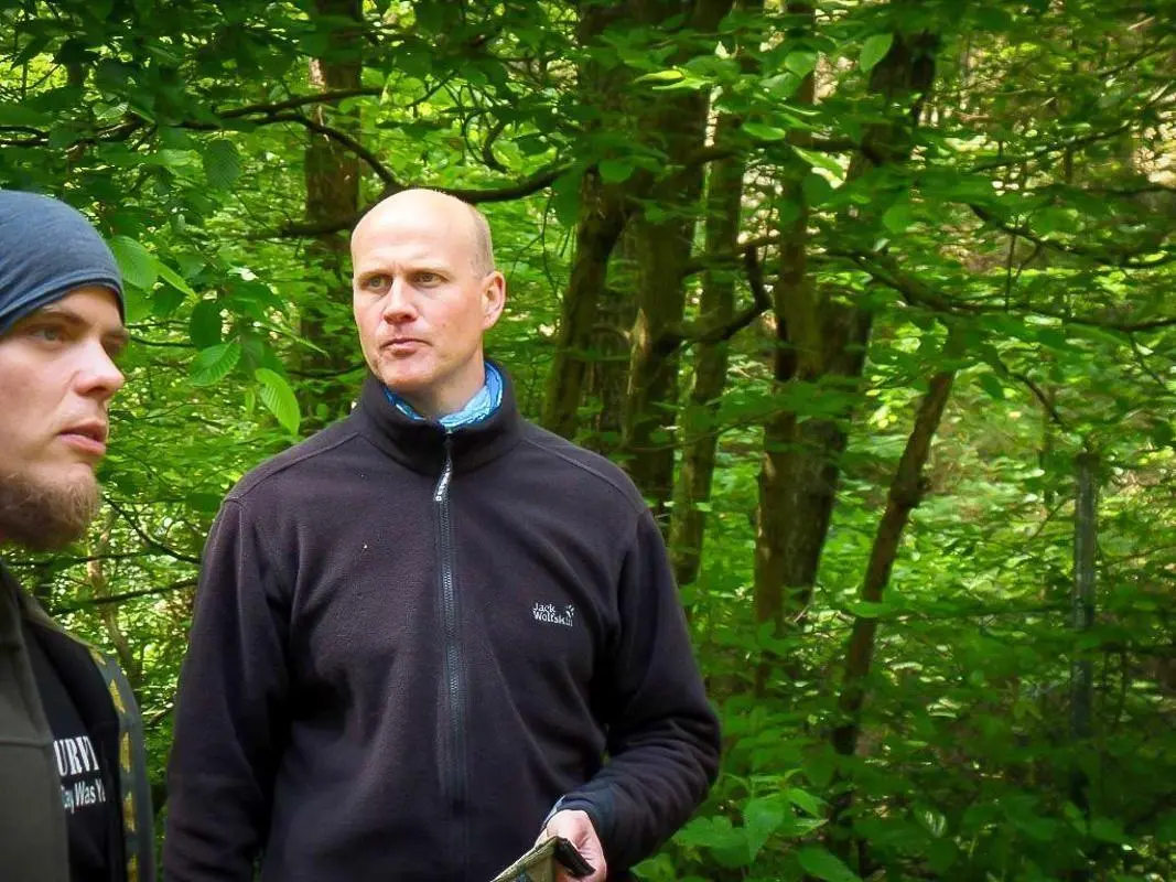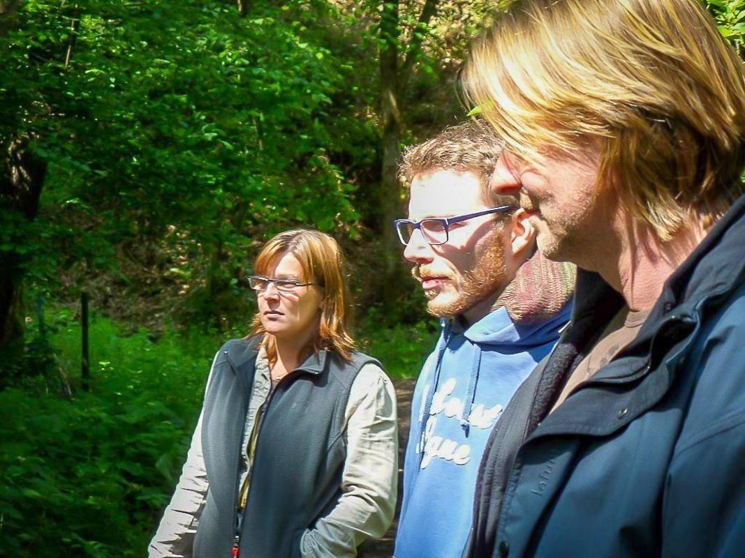 Gruppe steht auf einem Waldweg, eine Person erklärt mit Werkzeug in der Hand
