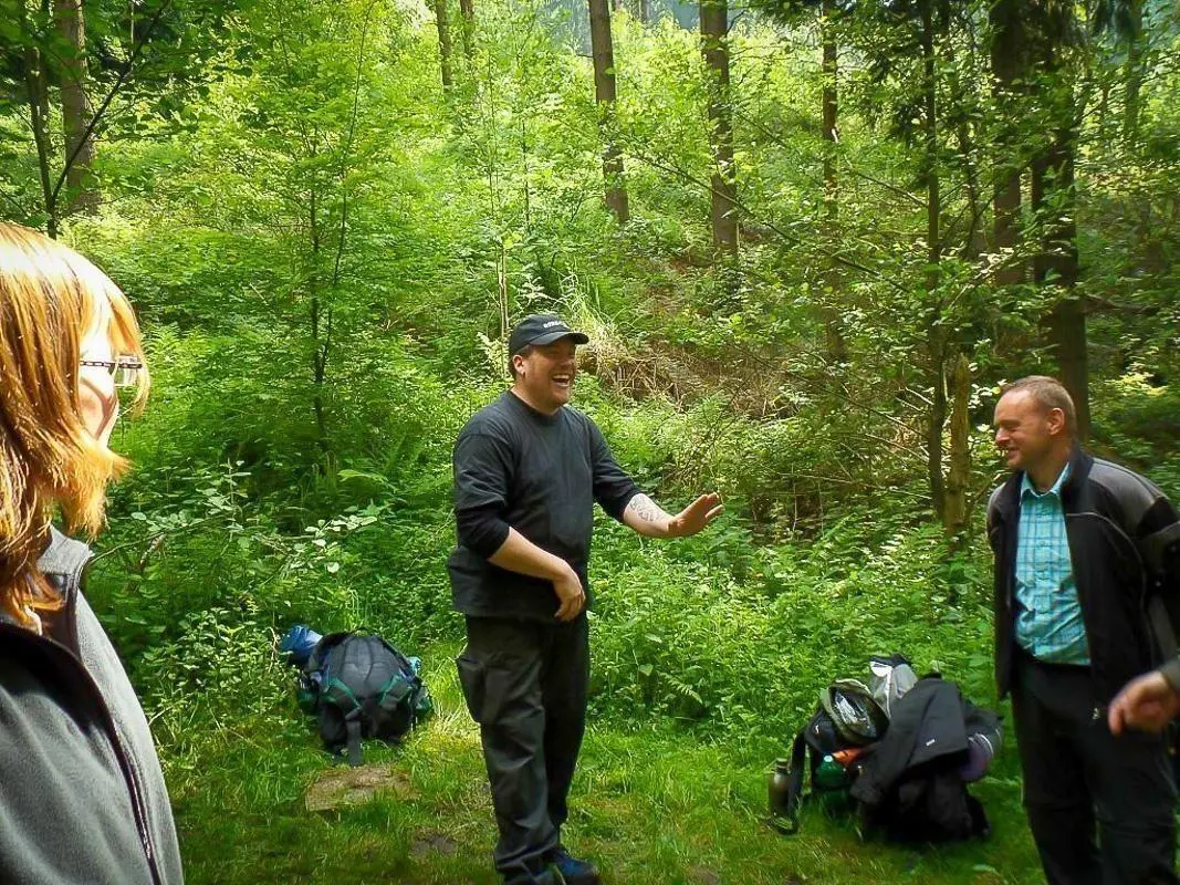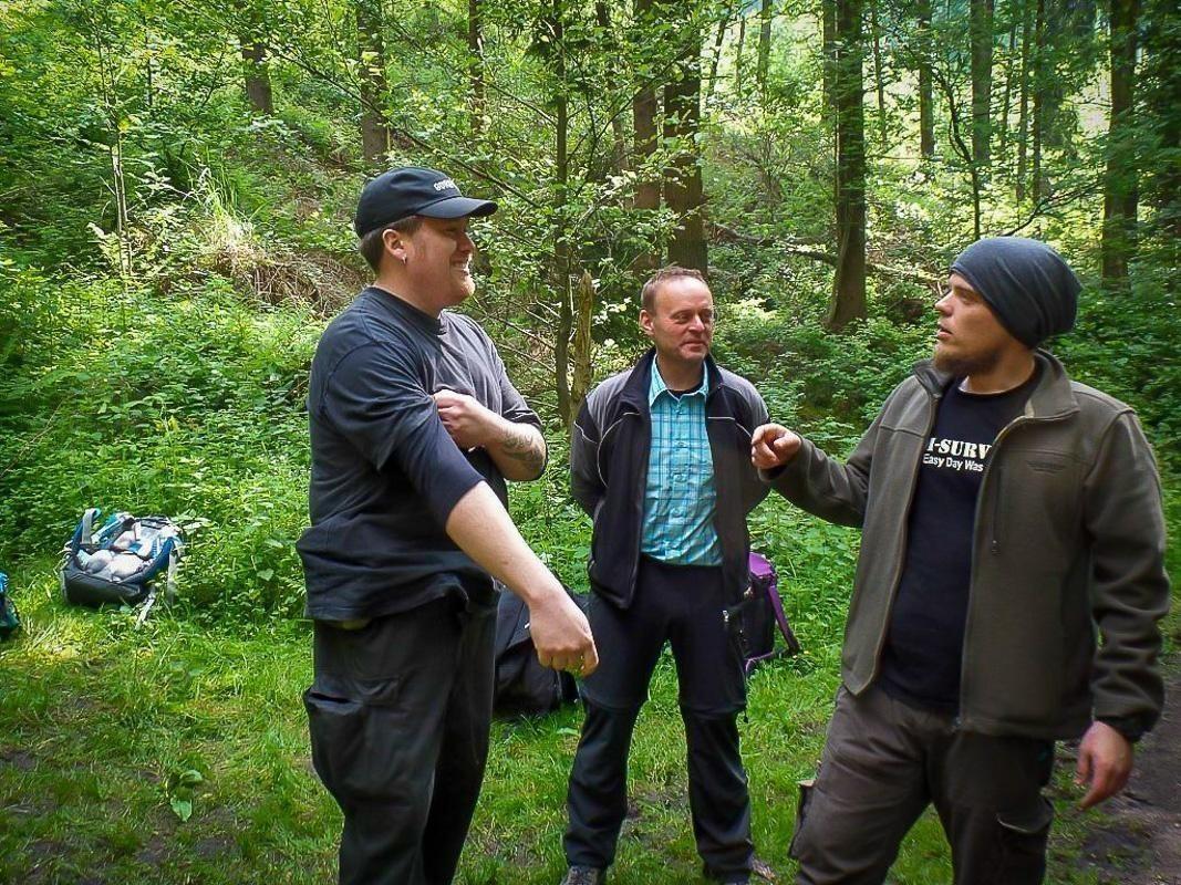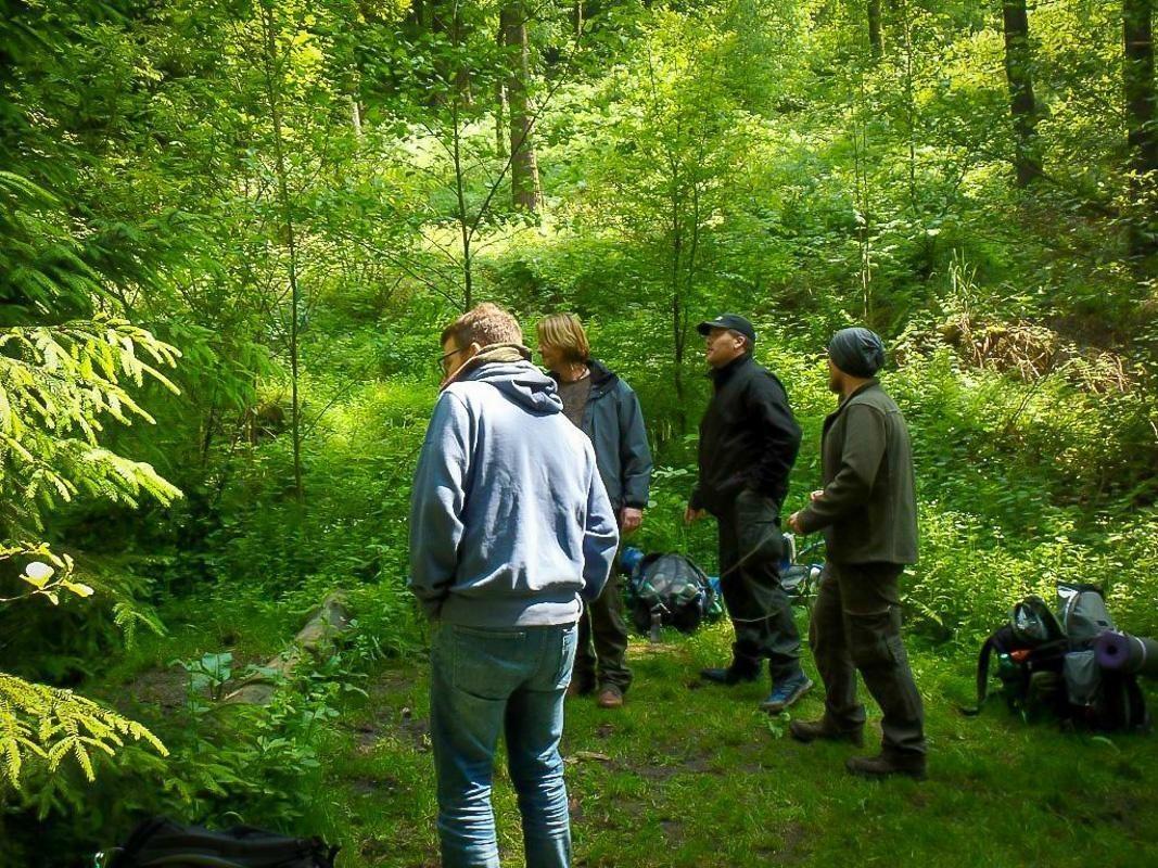 Drei Personen stehen im Wald und diskutieren, Rucksäcke liegen im Hintergrund
