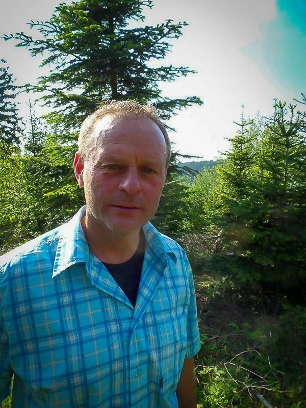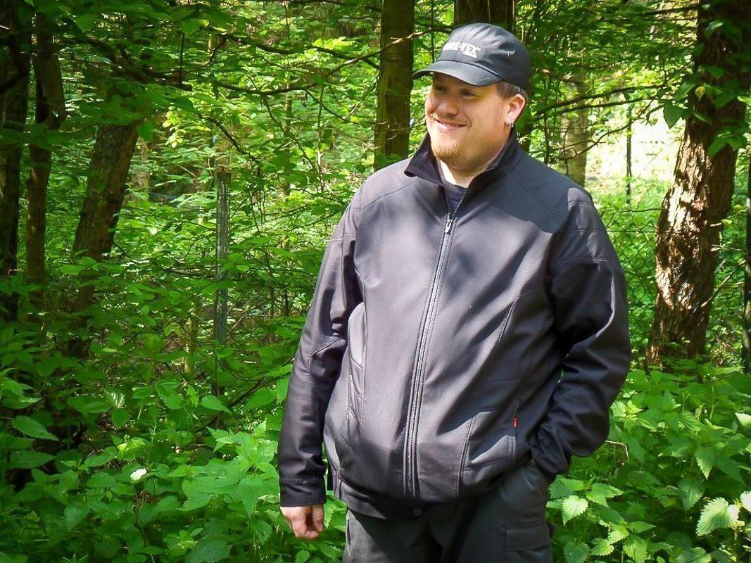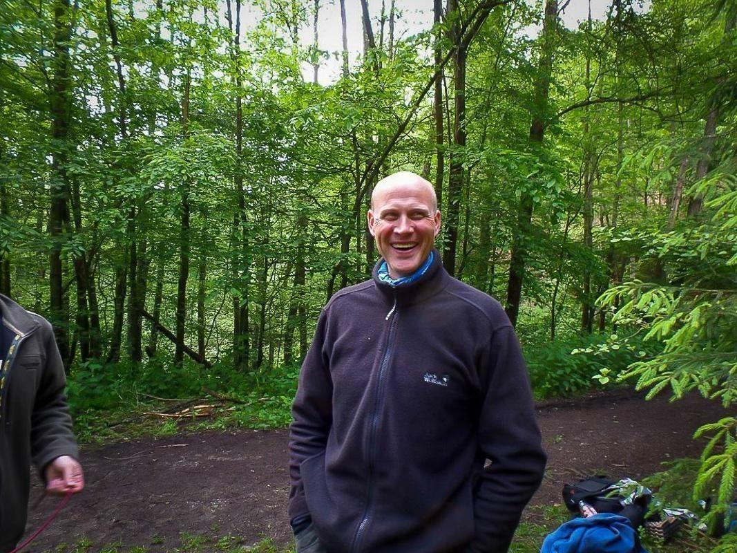 Ein Mann steht lächelnd im Wald zwischen Bäumen und grünen Pflanzen
