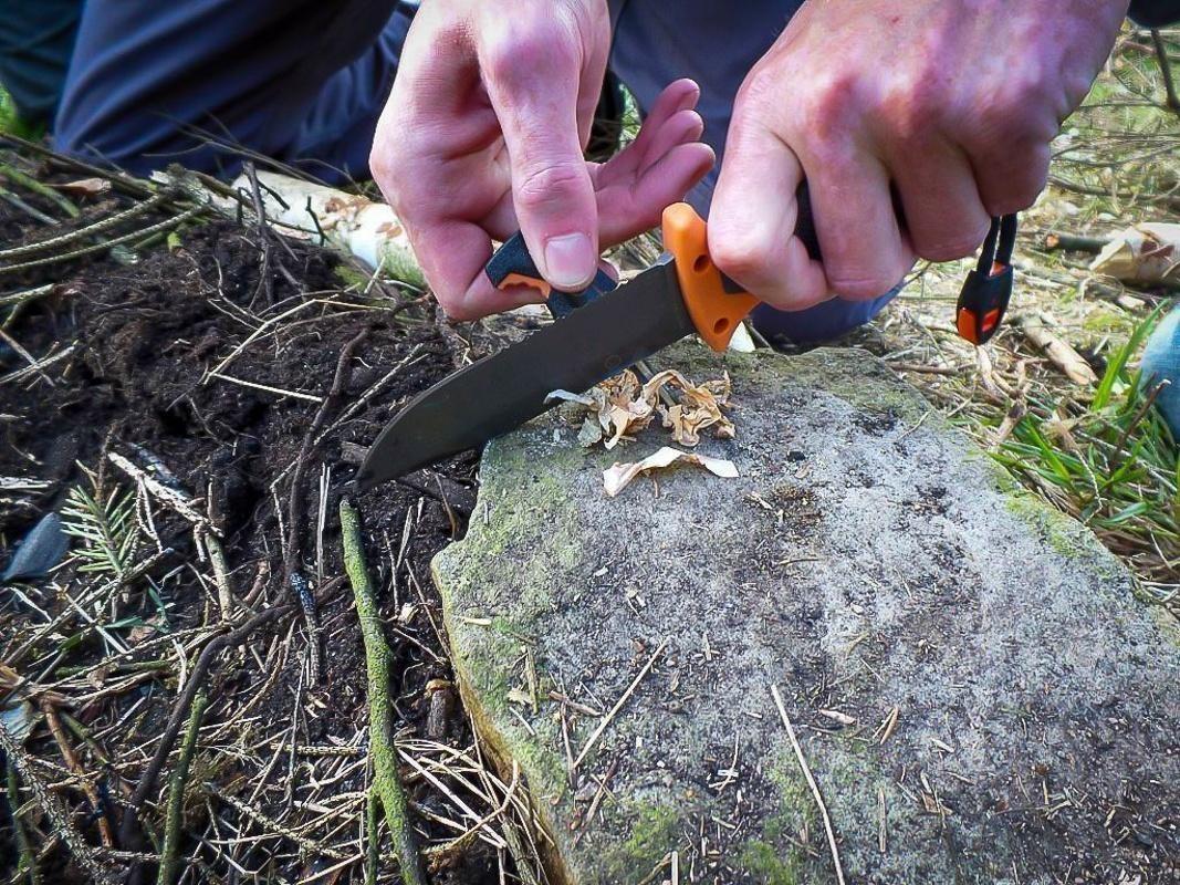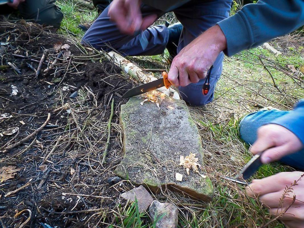 Messer schabt Holzspäne von einem Stein auf dem Boden