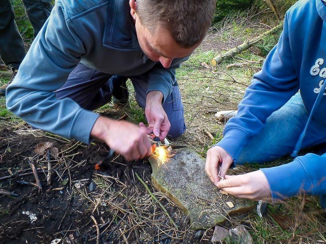 Feuerstahl erzeugt Funken auf Zunder, während zwei Personen konzentriert arbeiten