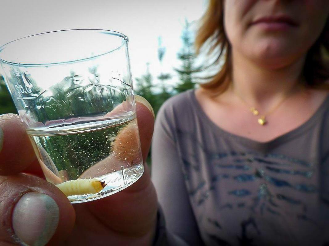Glas mit Wasser und einem Wurm wird von einer Person gehalten