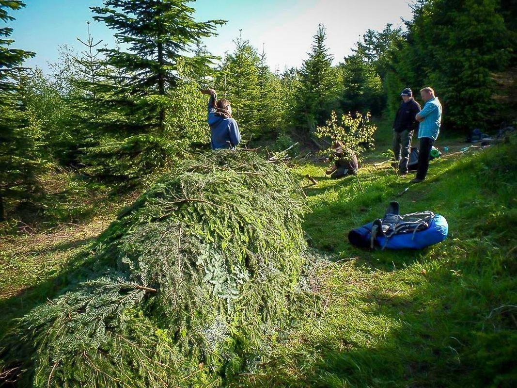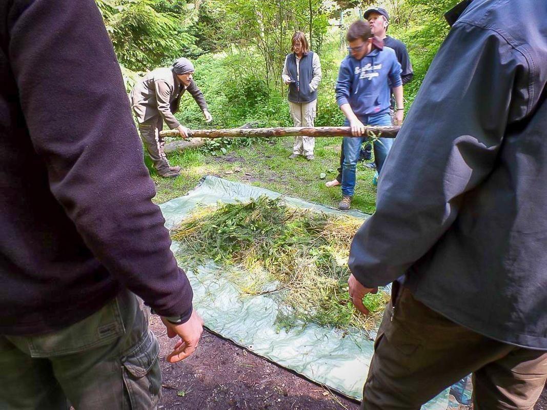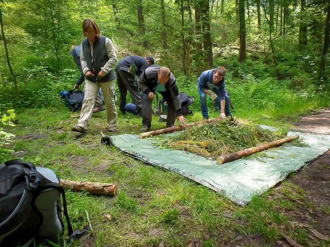 Gruppenteilnehmer bauen eine Tarp-Notunterkunft mit Ästen und Pflanzenmaterial