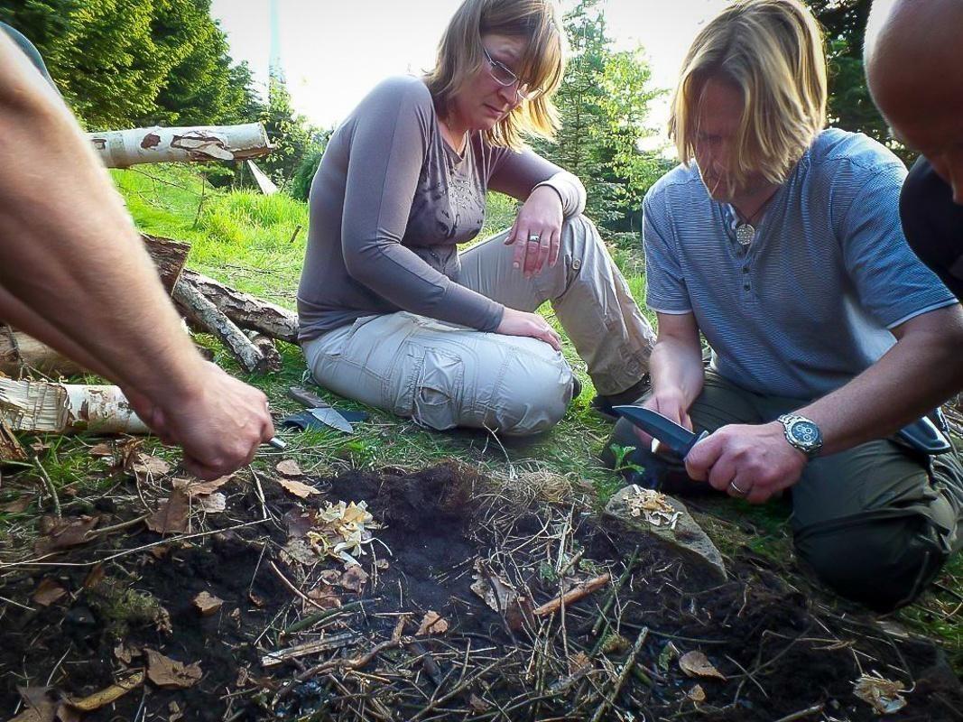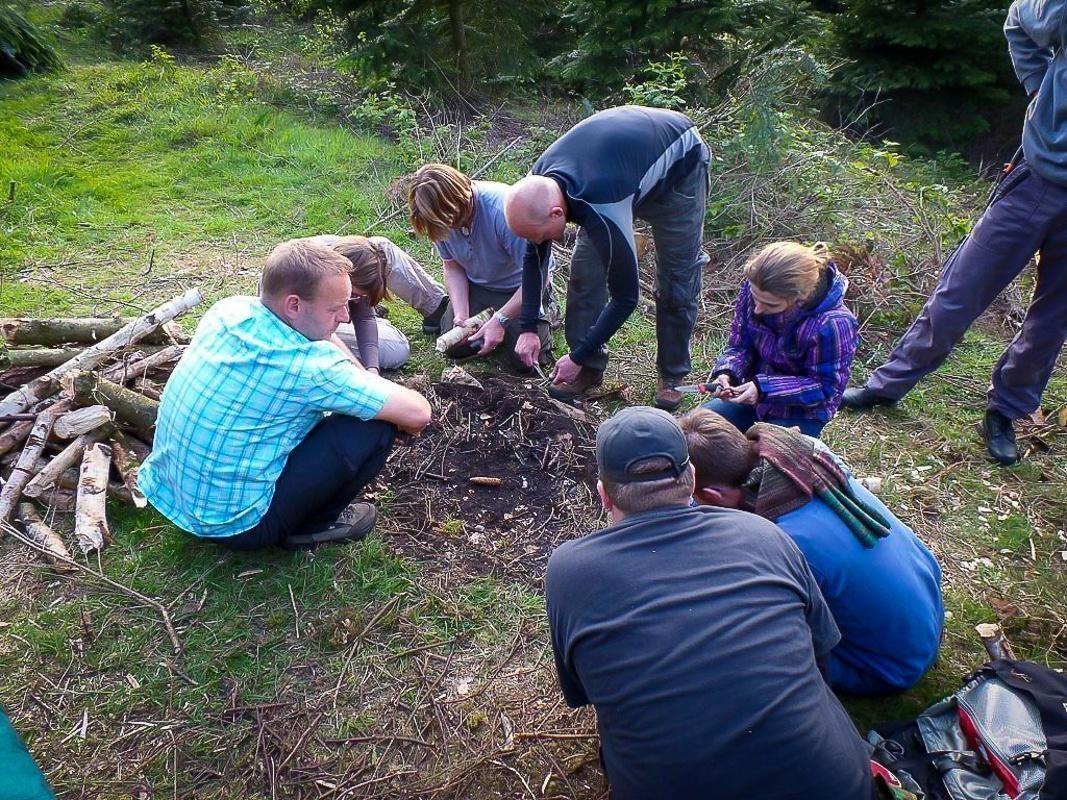 Gruppe arbeitet am Bodenfeuer und bereitet Zunder vor