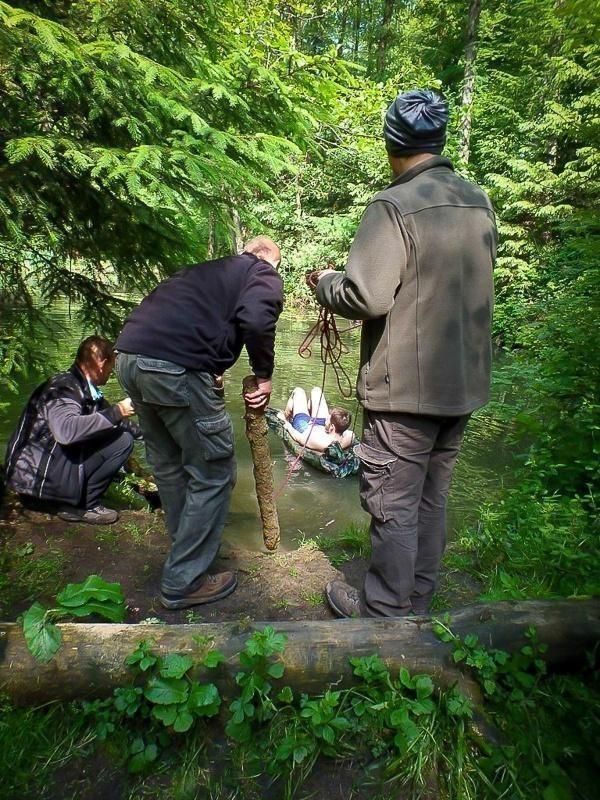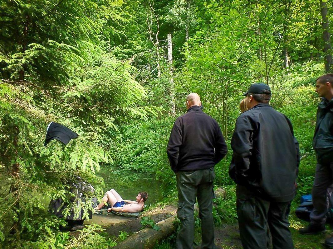 Gruppe beobachtet eine Person, die im Wasser liegt, umgeben von Bäumen und Sträuchern