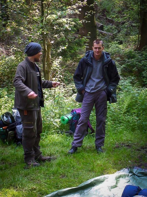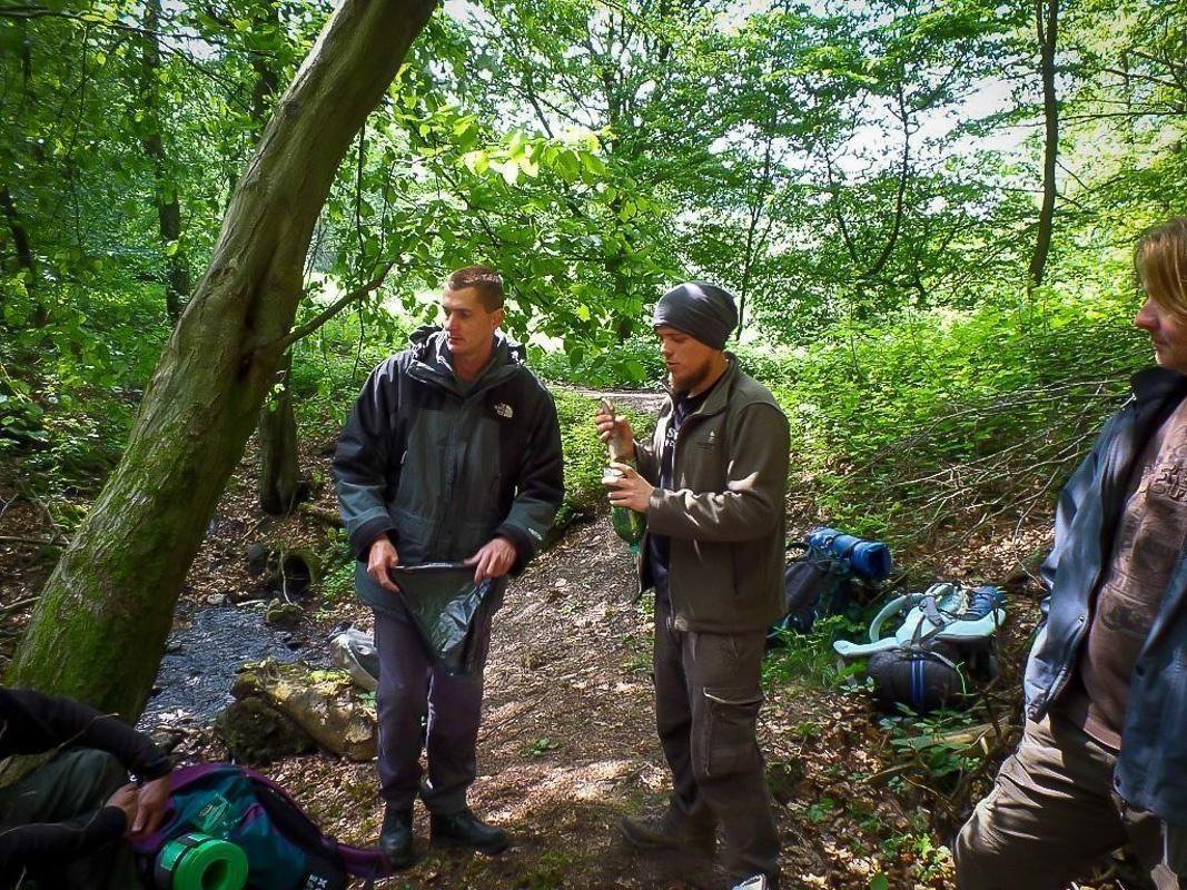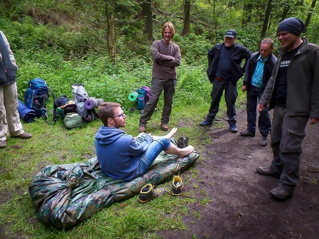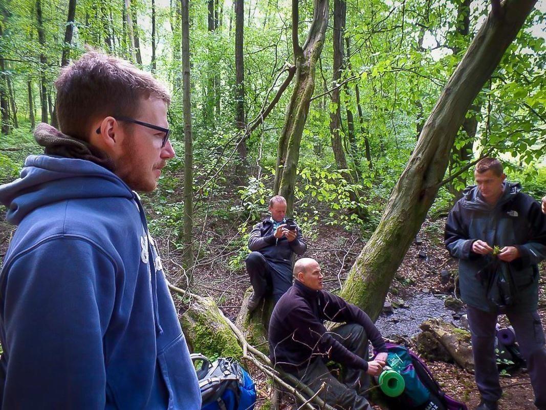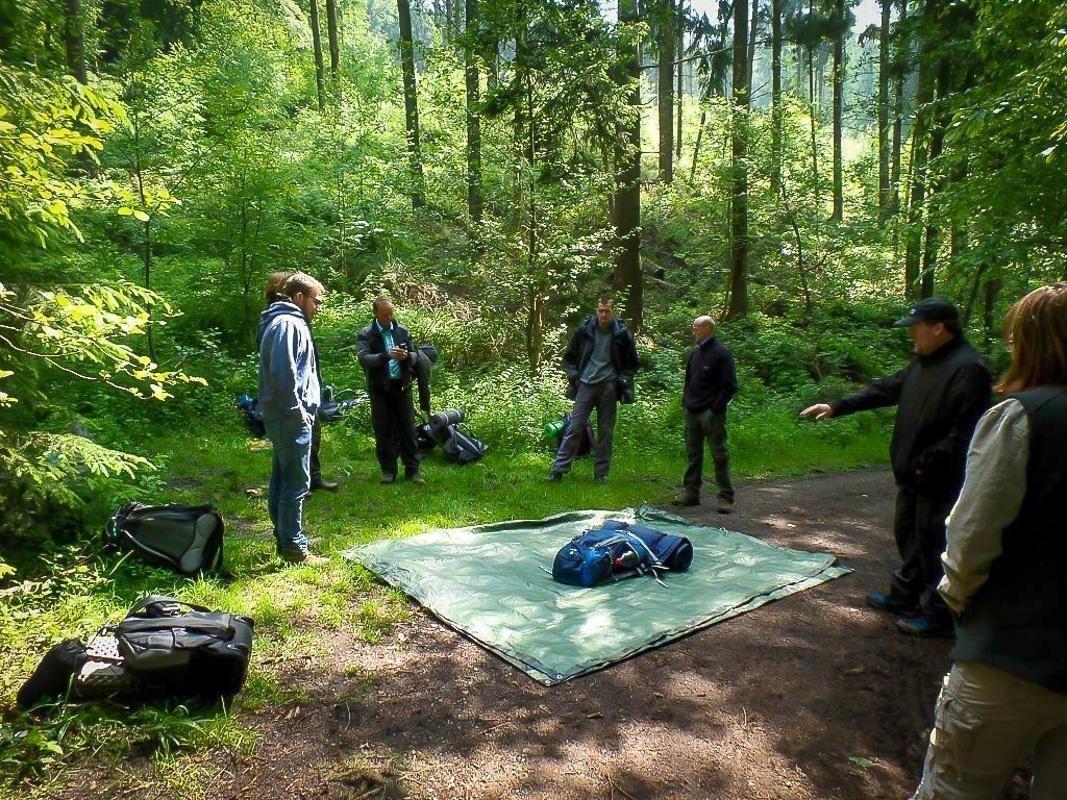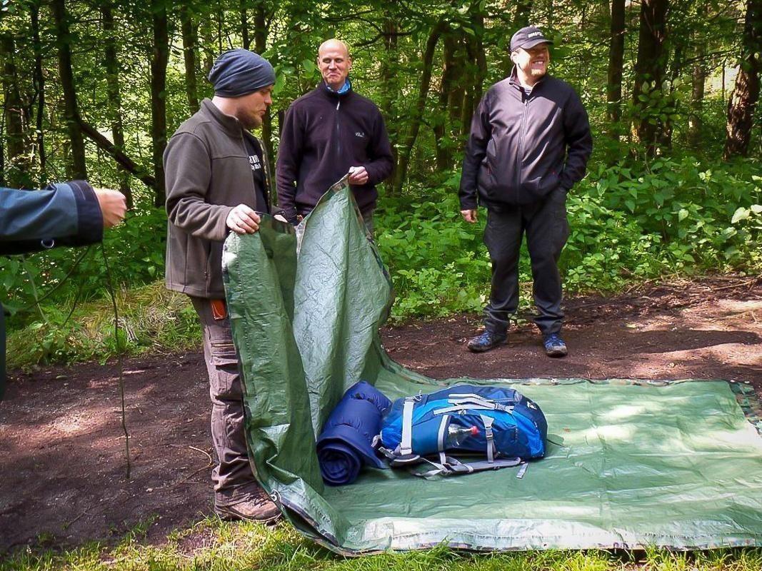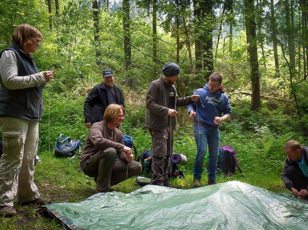 Gruppe diskutiert im Wald über Überlebenstechniken, Tarp liegt auf dem Boden