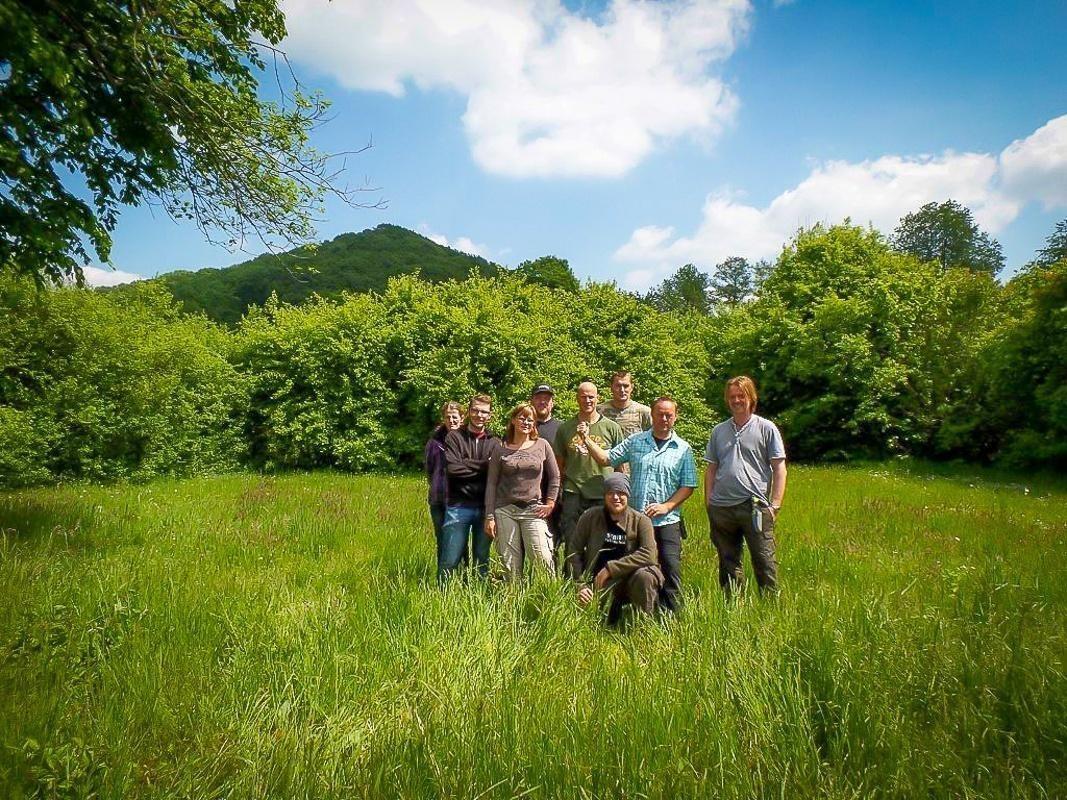 Gruppe von acht Personen steht in einer Wiese umgeben von Bäumen