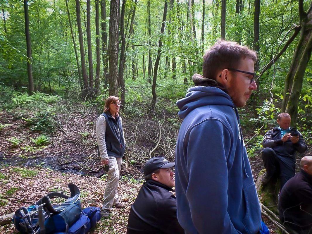 Fünf Personen stehen im Wald und betrachten die Umgebung, Rucksäcke liegen am Boden