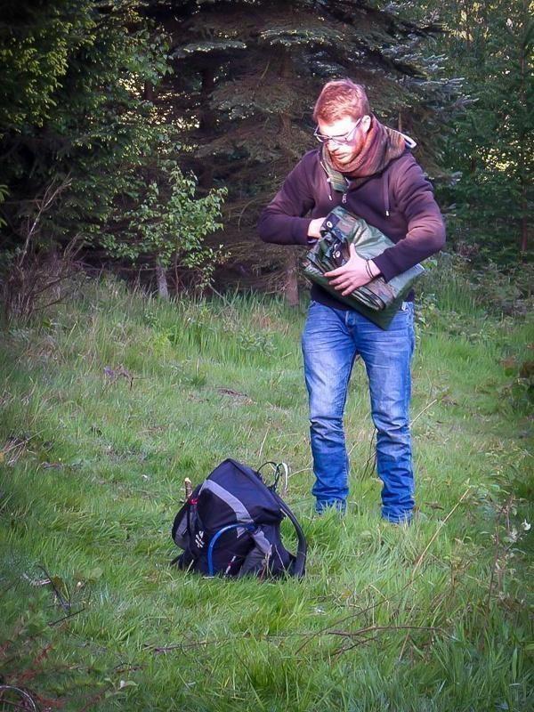 Mann entnimmt Ausrüstung aus einer Tasche auf einer Wiese im Wald