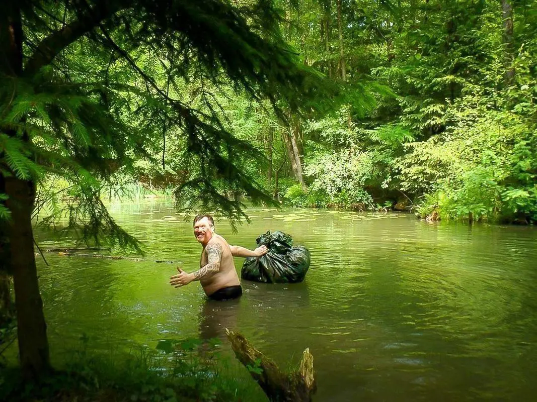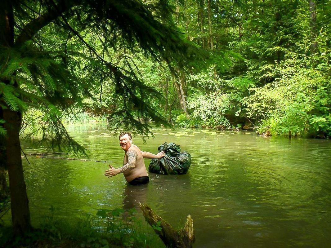 Mann watet mit einem Müllsack durch einen klaren Fluss
