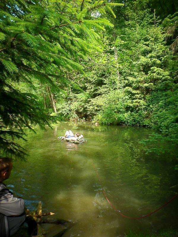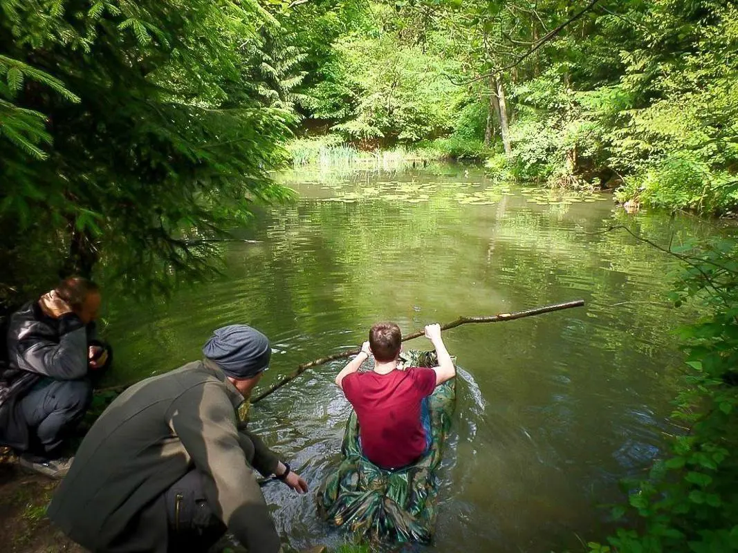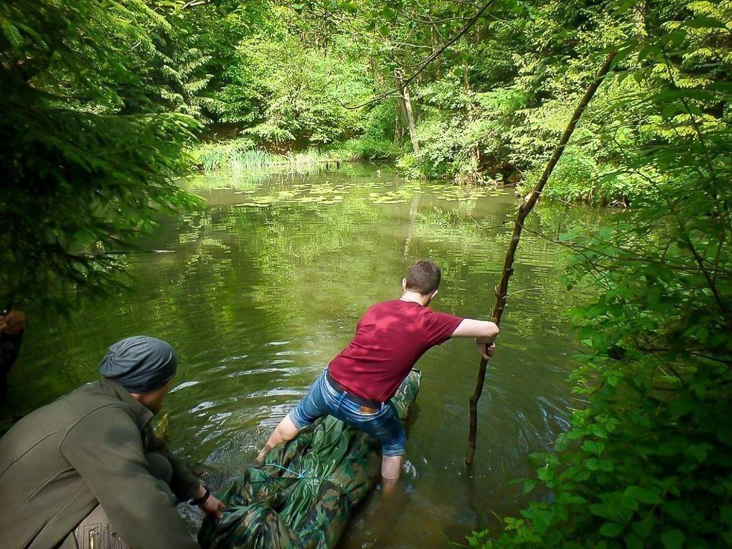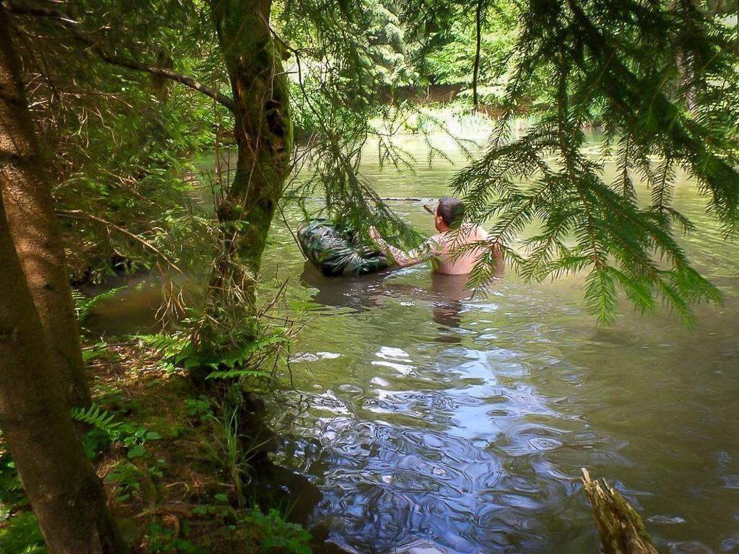Person sitzt auf einer camouflagefarbenen Plane im Wasser und balanciert auf einem Ast