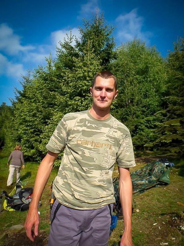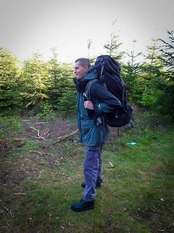 Ein Mann posiert fröhlich im Wald, Rucksack und Ausrüstung liegen am Boden