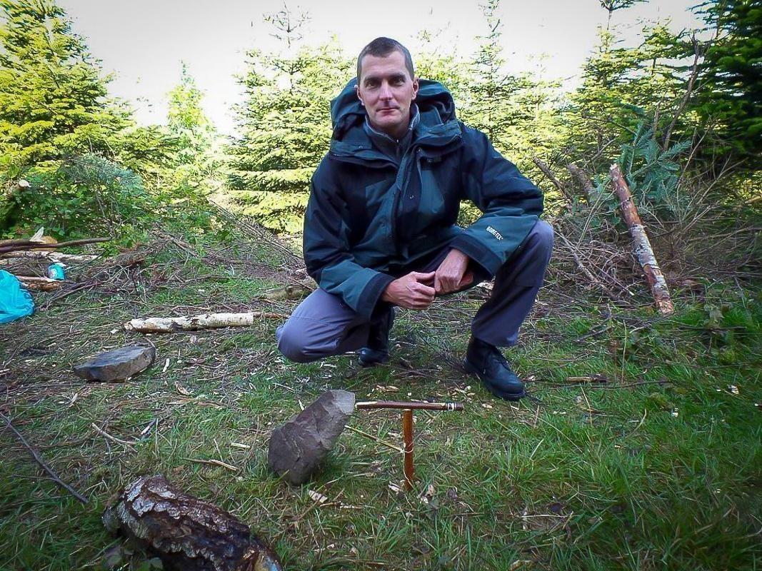 Mann kniet neben einer Schlagfalle (Figure-Four-Falle) im Wald