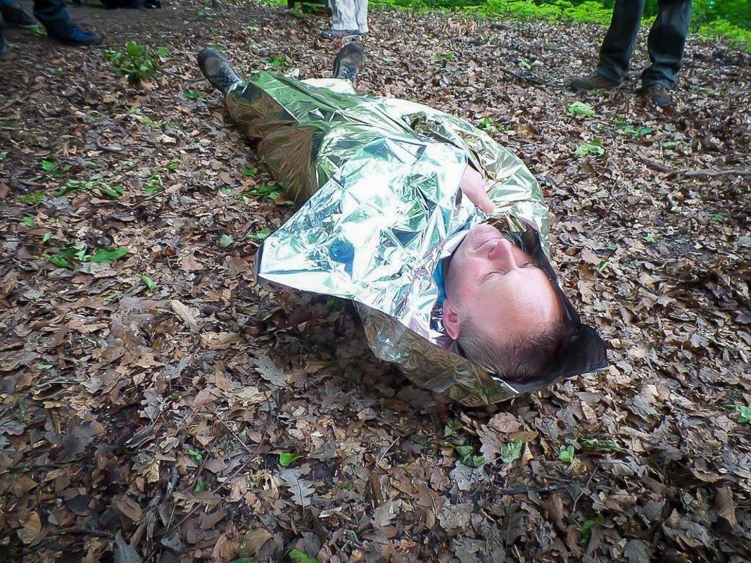Person in Rettungsdecke liegt auf dem Boden, während eine andere Person hilft