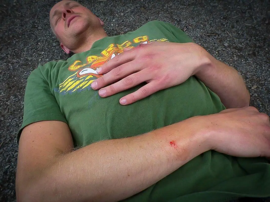 Mann liegt auf dem Boden mit einer kleinen Wunde am Unterarm