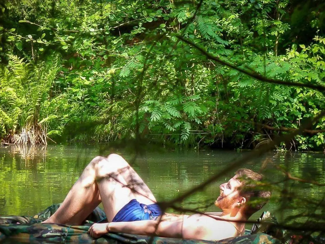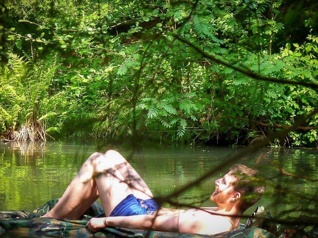 Mann liegt entspannt auf einer Matte am Ufer eines Gewässers, umgeben von Pflanzen